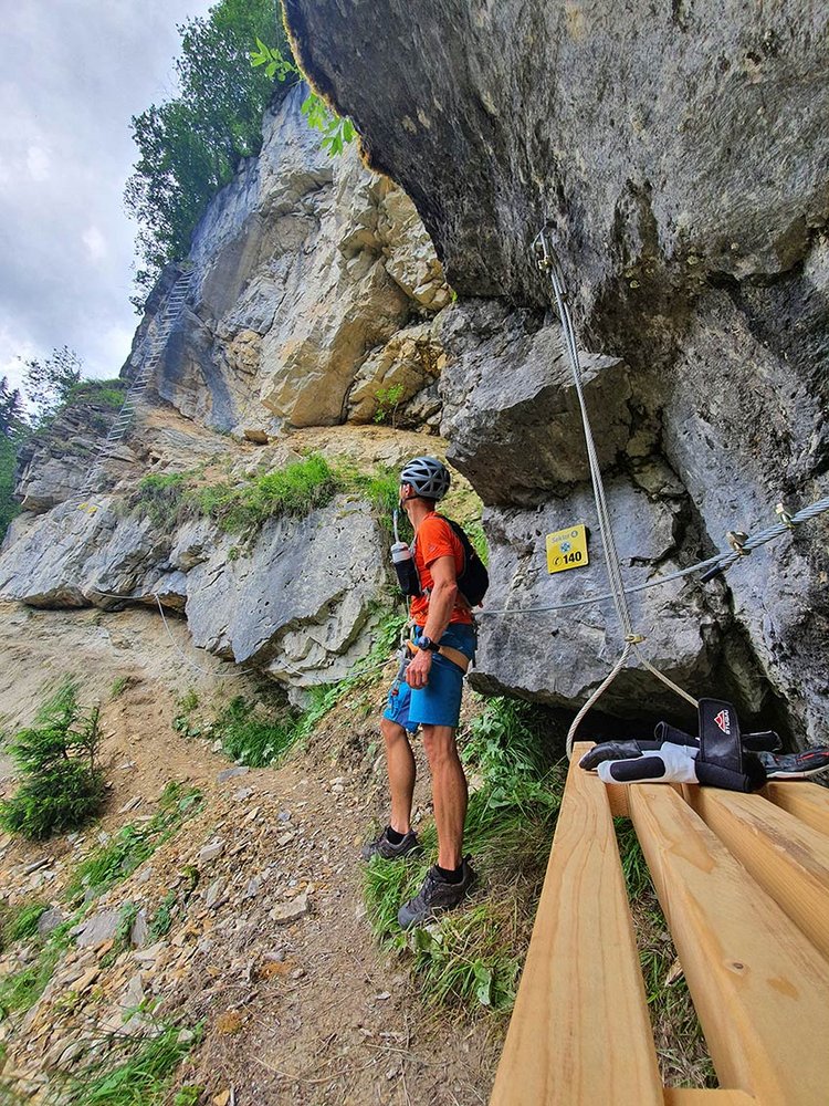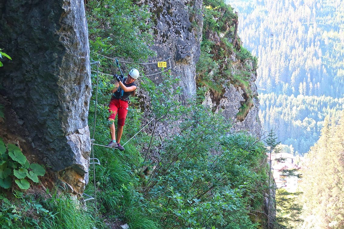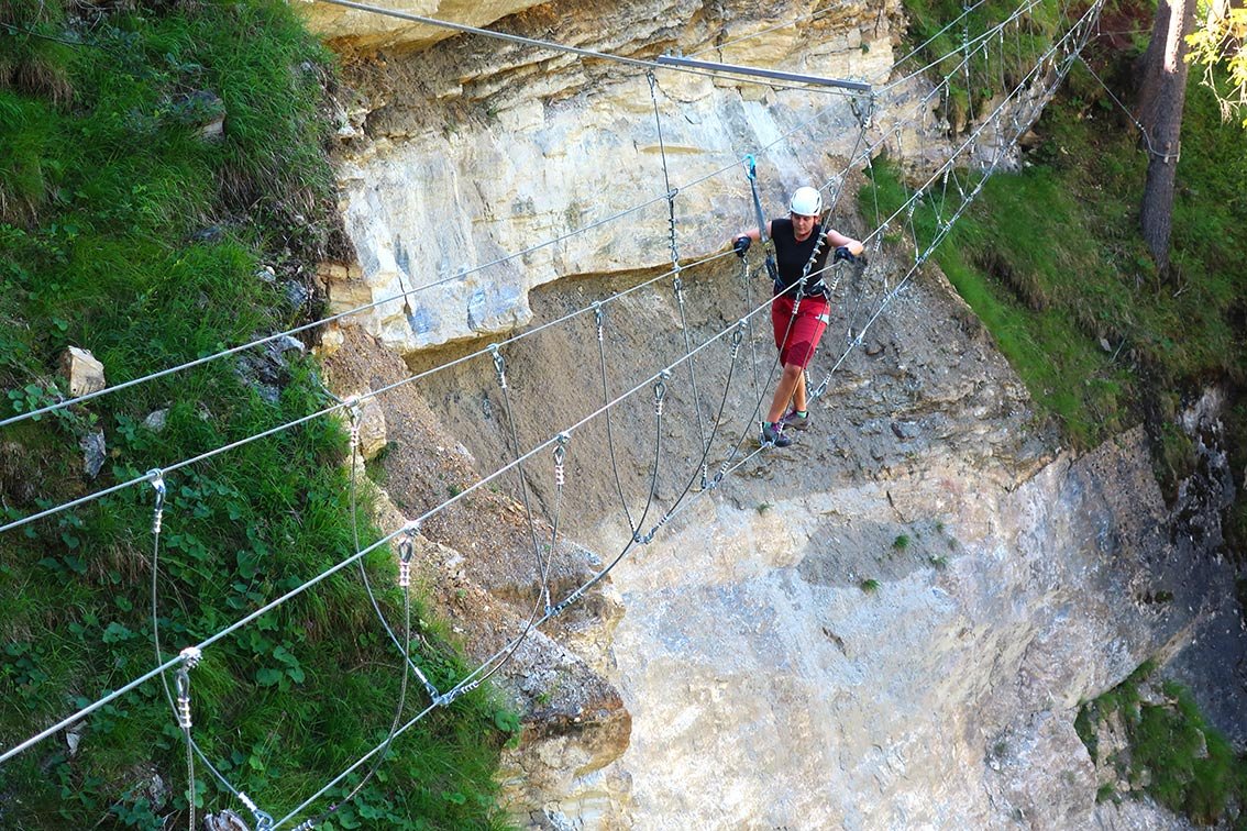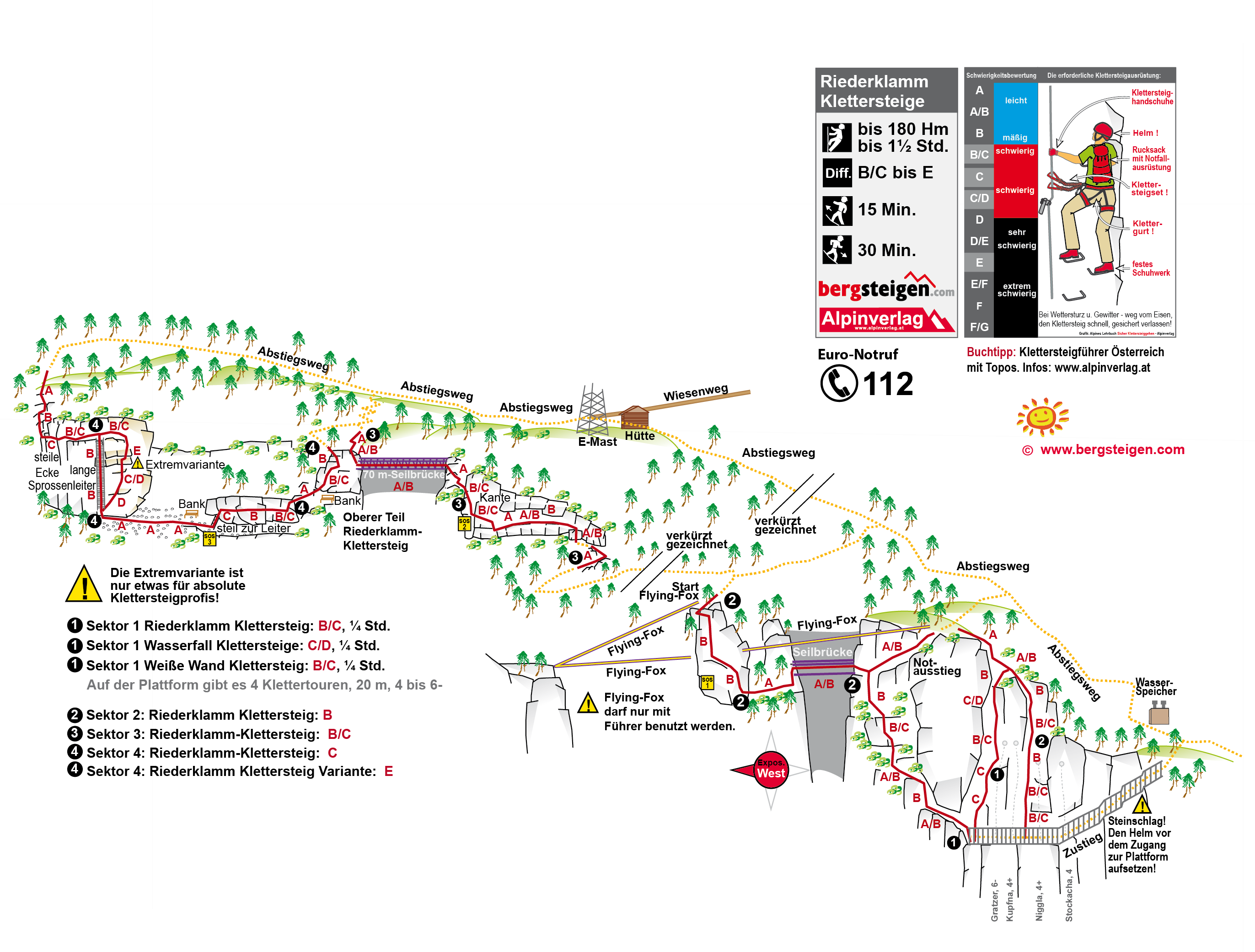 Siehe Topo. Die beiden rechten Klettersteige auf der Plattform haben einen ziemlich sportlichen Charakter, sind aber kurz. Der eigentliche Riederklamm-Klettersteig beginnt ganz links auf der Plattform, nach der Seilbrücke folgt eine Steilwand. Nach dieser auf dem Steig zum oberen Teil. Es folgt ein Abschnitt mit einer langen Seilbrücke, gleich nach der Seilbrücke geht es links zum Abschnitt mit der E-Variante. Es gibt diverse Notausstiege - siehe Topo.