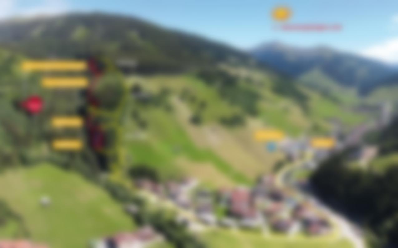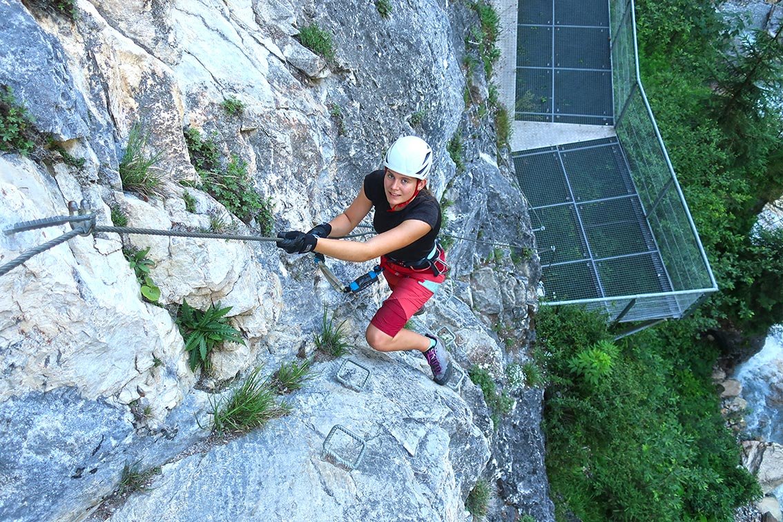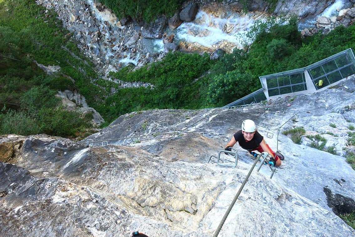 Vom Parkhaus zurück zur Hauptstraße und entlang dieser talauswärts bis in den Ortsteil Ried. In Ried der Straße zum Gästehaus Waldruh folgen und dann an der östlichen Bachseite aufwärts bis man zu einem Wehr kommt. Anschließend rechts dem Wiesenweg kurz bis zu einem Wasserreservoir folgen, dort den Helm aufsetzen. Dann links auf dem Eisensteg hinunter zur Plattform.