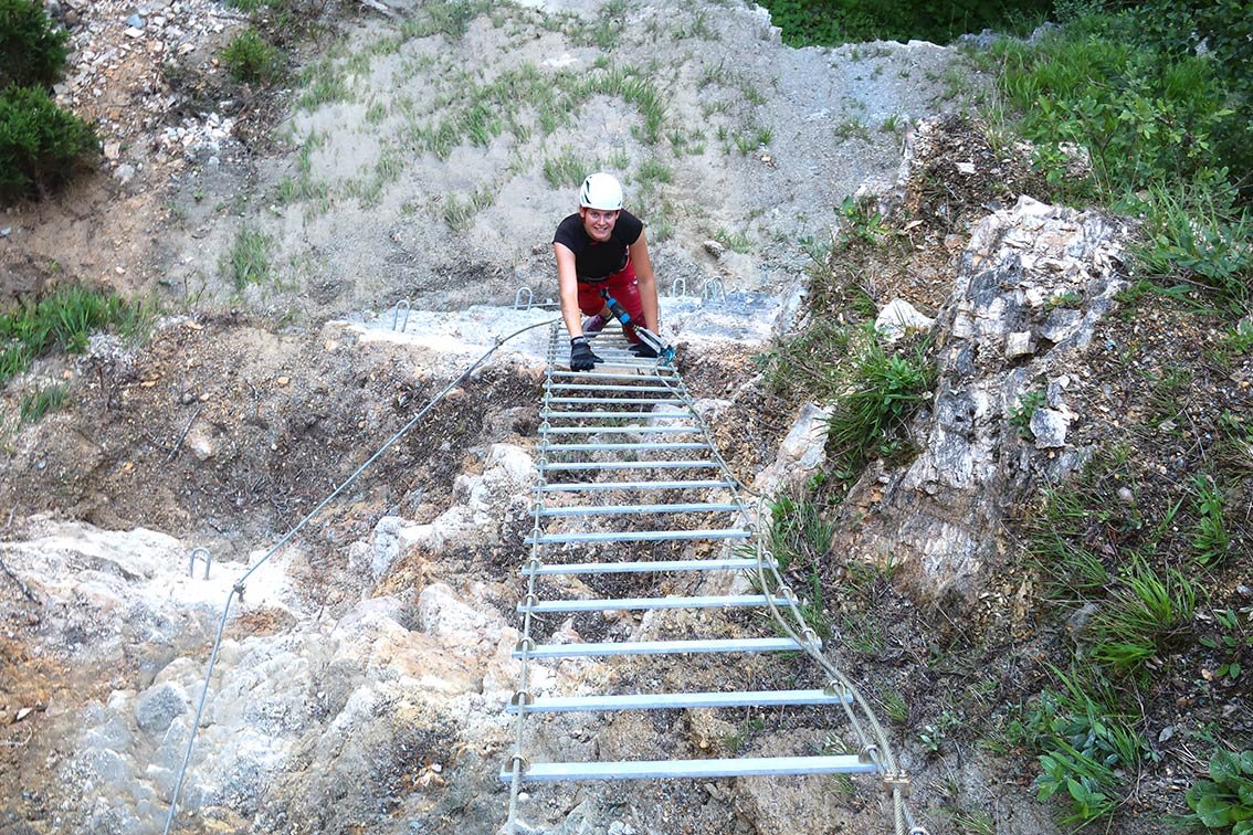 Der lange Klettersteig ist B/C - nach der 70 m-Seilbrücke folgen Stellen C und eine Varianten E. Die kurzen Übungsklettersteige am Beginn bei der Plattform sind C/D und B/C. Siehe Topo.
