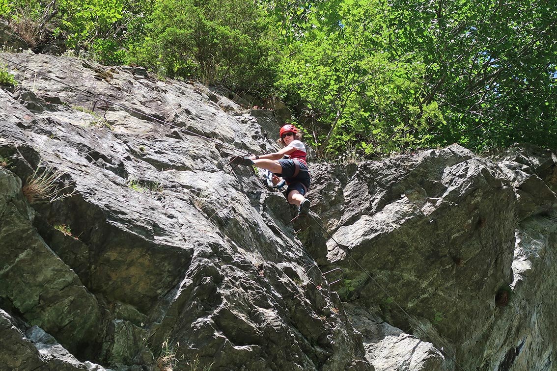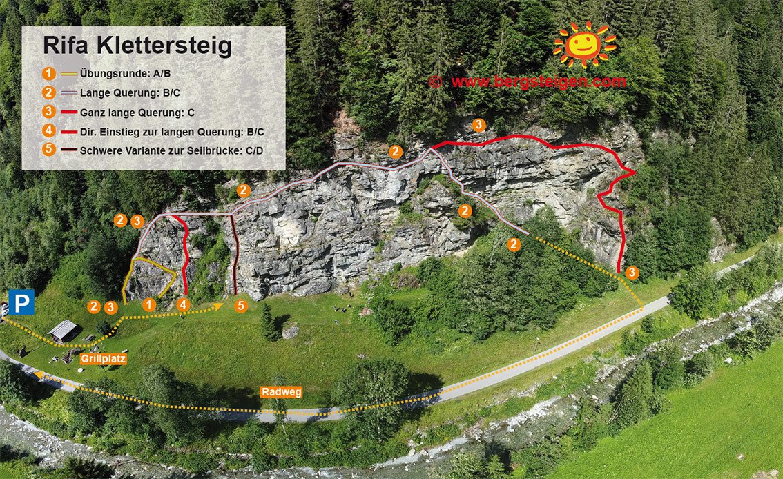 Übungsklettersteig in einem schön gelegenen Rifa-Klettergarten, der sich vor allem zum Training und für Kurse eignet. Es gibt verschiedene Varianten und eine Seilbrücke. Das Areal um den Klettergarten ist sehr schön gestaltet, neben dem Klettergarten gibt es eine Blockhütte, ein Wasserspiel und eine Grillstelle, also auch für Familien sehr gut geeignet. Wenn das Wetter etwas unsicher ist, ist der Rifa Klettersteig eine gute Gelegenheit, doch etwas in der Vertikalen zu machen.