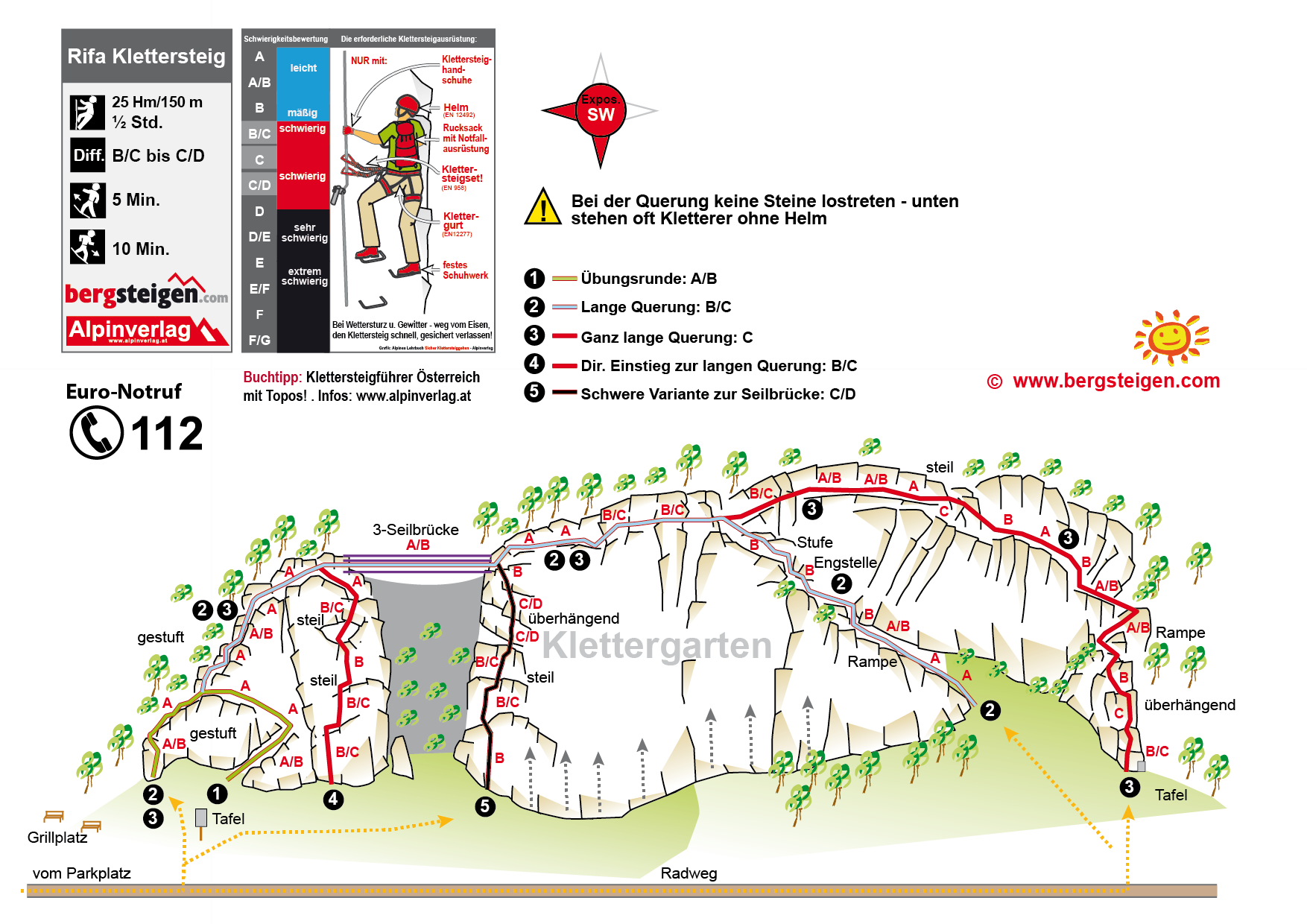 Um eine sinnvolle Runde zu klettern muss man B/C bewältigen (bei der lange Traverse). Wenn man ganz links zur Seilbrücke hinaufsteigt und wieder absteigt ist A/B zu meistern.
