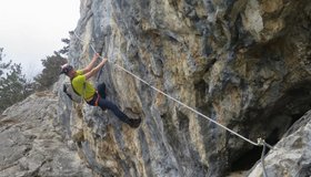 Einstiegsquerung D/E, dann bis zu C/D und beim Pfeiler wieder kurz gut D. Die Schwierigkeit kann sich durch zusätzliche Klammern, eventuell noch etwas verändern.