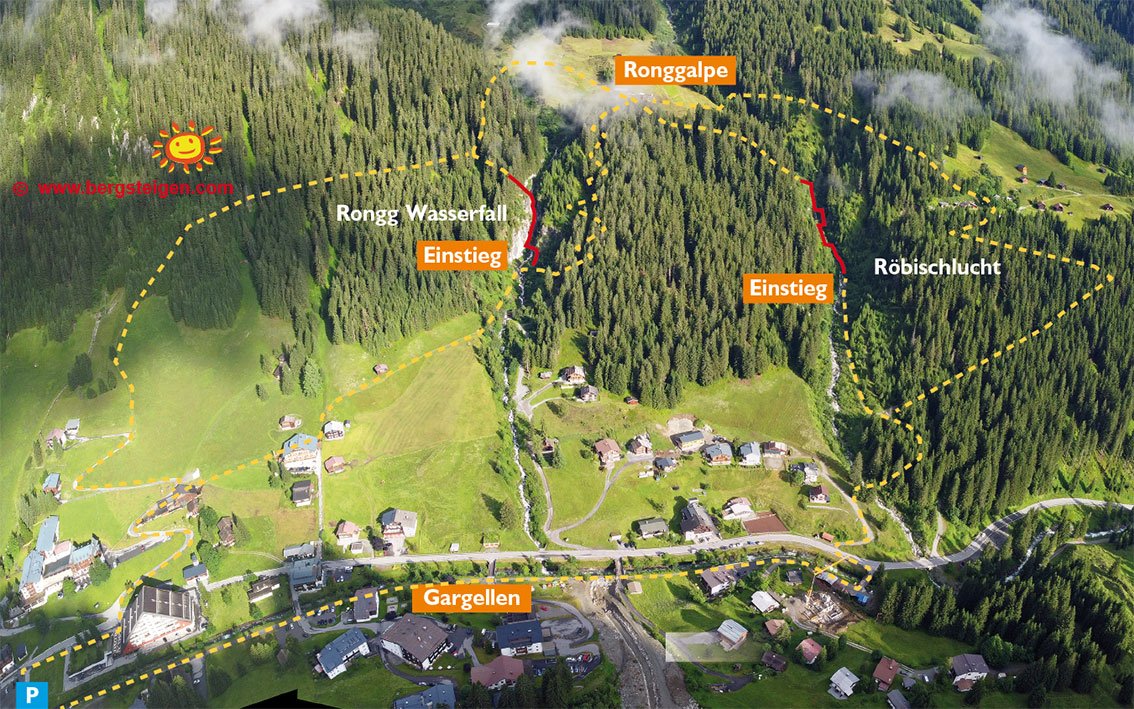 Am nördlichen Dorfrand auf einem Wanderweg Richtung Röbimaisäß, bei einer Abzweigung dem Pfad entlang des Röbibaches auf dessen rechter Seite folgend bis zum Einstieg.