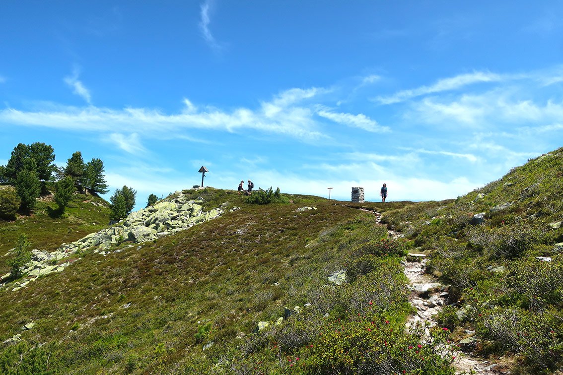 Vom Gipfel zuerst auf dem markierten Wanderweg absteigen. Auf ca. 2310 m zweigt ein Pfad (Theodor-Streich-Weg) nach Westen ab. Auf diesem steigt man zur Bergstation der Brunnenkopf-Bahn ab und von dort wieder entlang des Wanderweges zur Bergstation der Acherkogelbahn.