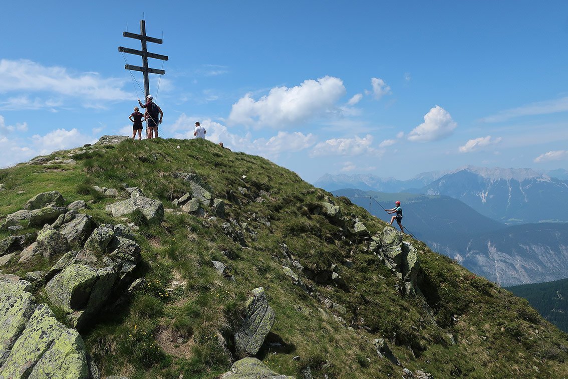 Der Rosskopf Klettersteig mitten im Skigebiet Hochötz ist eine nordseitige Ferrata auf die sogenannten Rossköpfe. Der Klettersteig wurde mehr oder weniger ausgegraben und so eine mit 300 m Stahlseil gesicherte Spur durch die Nordwand des Rosskopfes gelegt. Oft an gestuften Gratpassagen und ganz kurzen, steileren Abschnitten steigt man in Richtung Gipfelkreuz. Der Klettersteig an sich ist kein Meisterstück unter den Klettersteigen, im Gesamtpaket, mit sehr schönem Inntalblick und schneller Erreichbarkeit mit der Seilbahn aber durchaus einen Ausflug wert.