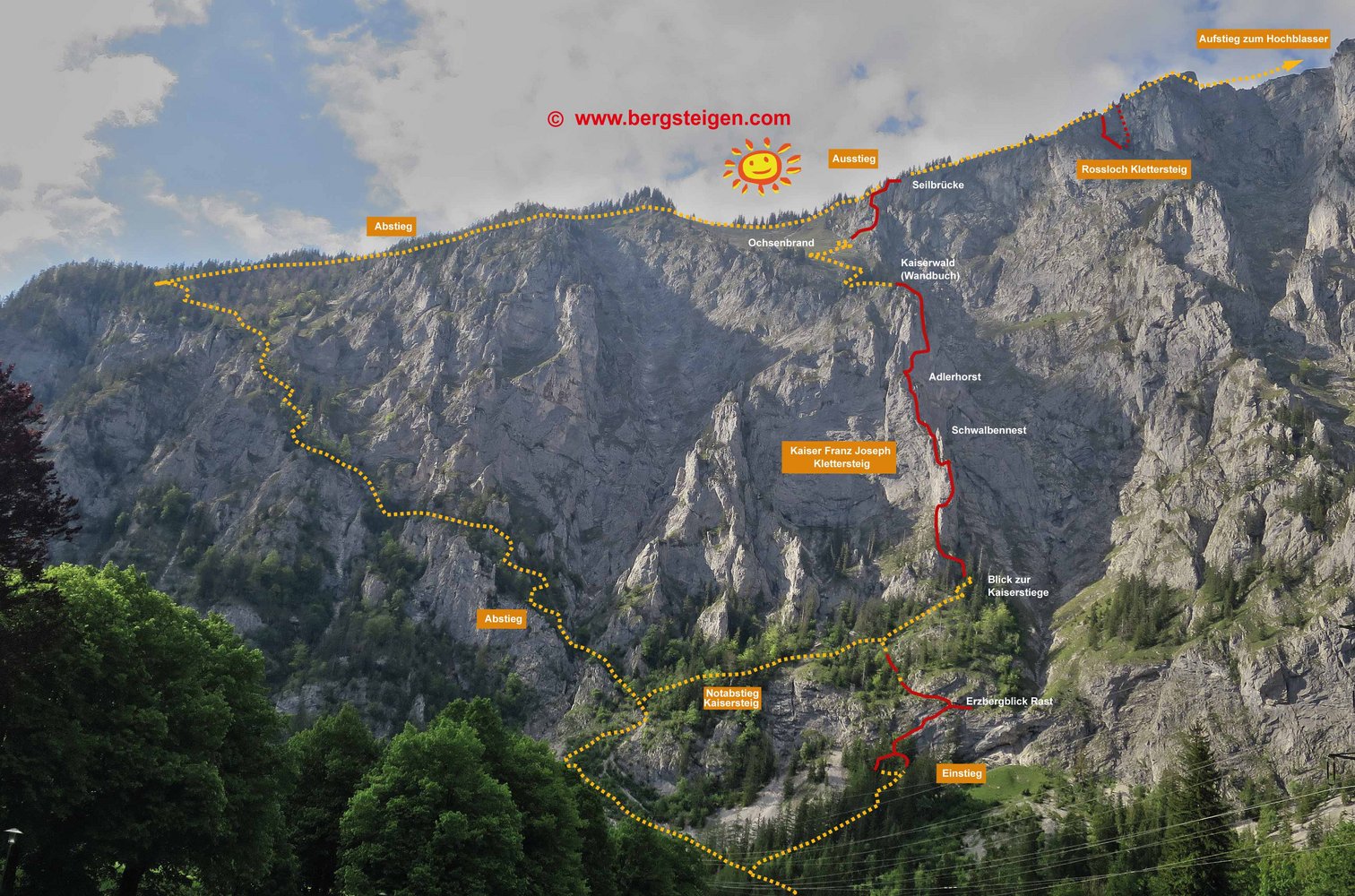 Wer nach dem Kaiser-Franz-Joseph-Klettersteig keine Kraft mehr hat, soll nicht hinunter zur Höhle klettern (unten gibt es keine Fluchtmöglichkeit, man muss also auf jeden Fall wieder aufsteigen und die Klettersteigpassagen sind deutlich schwerer als beim Kaiser-Franz-Joseph-Klettersteig !!!)