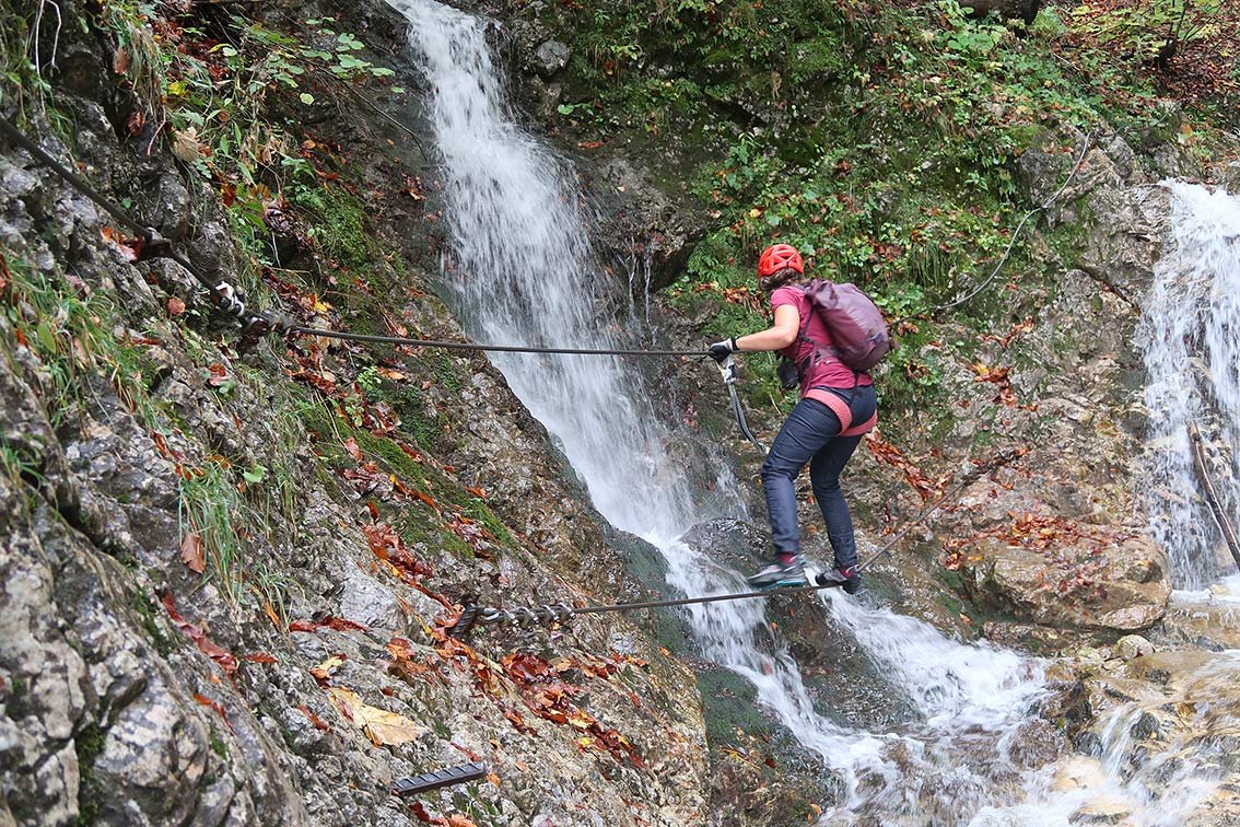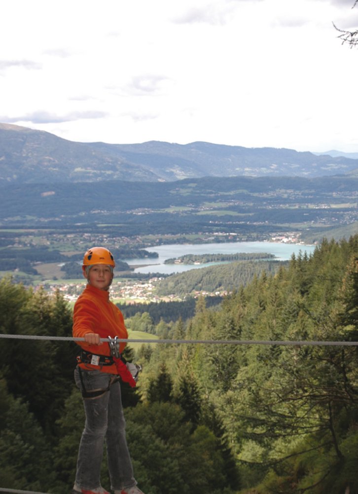 Schöner Klamm-Klettersteig im Nahbereich eines Wasserfalles. Die schon länger vorhandene Steiganlage wurde von der Alpinschule 4-Jahreszeiten vorbildlich saniert und ist seitdem für klettergewandte Kinder und Gruppen ein spektakuläres Abenteuer - einzigartiger Panoramablick zum Faaker See!