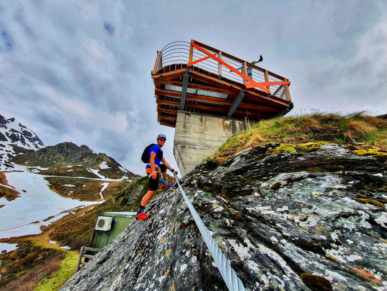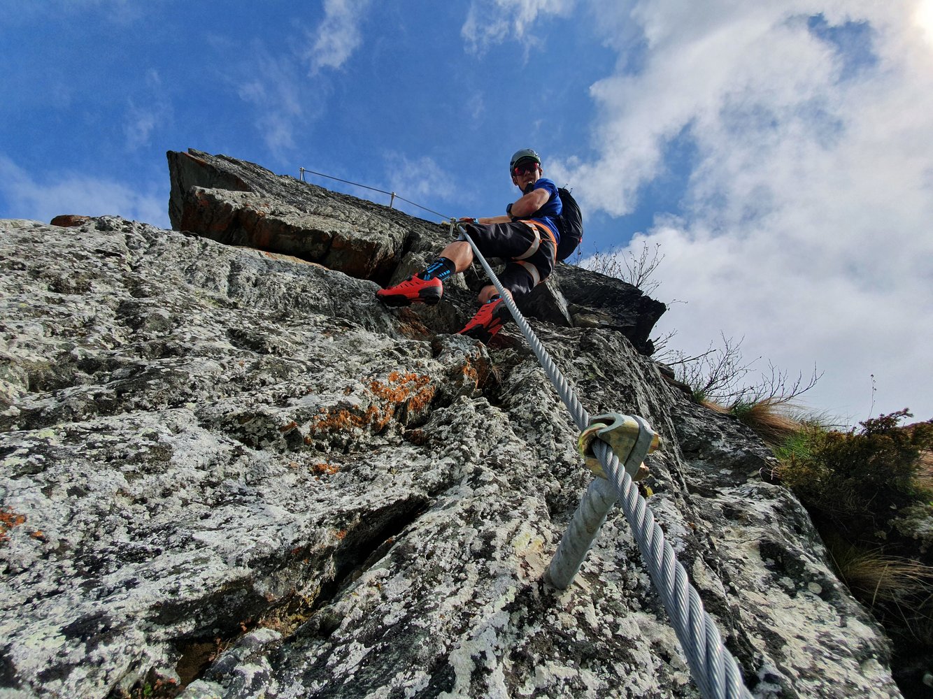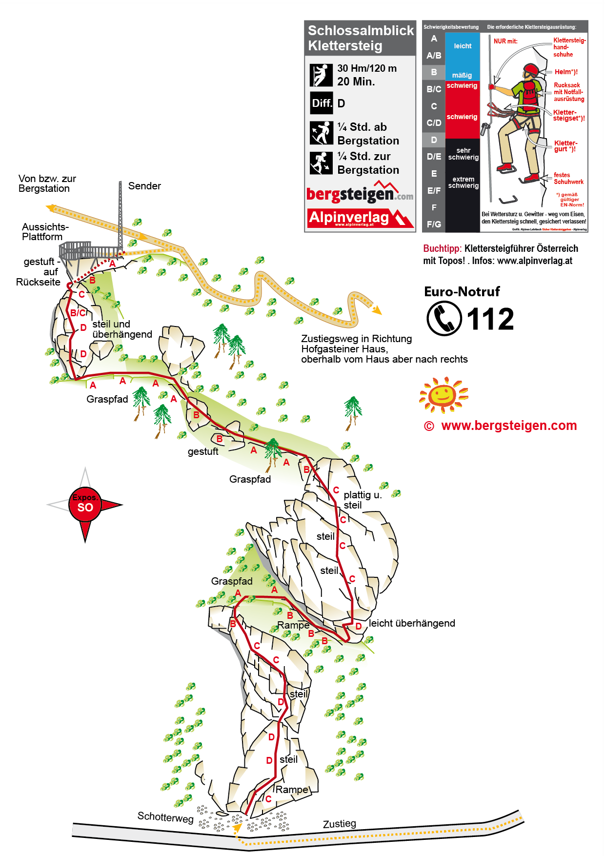 Siehe Topo: Von der Strasse geht es in eine Querung (C) die sofort in einen steilen Aufschwung (D) mündet. Leicht absteigend (B) auf Trittbügeln kommt die Schlüsselstelle mit einem steilen D-Aufschwung der in das Gehgelände (B und A) zwischen den beiden Felsen mündet. Von dort an der Fotogenen und steilen Schlusswand (D) hinauf zur Plattform.