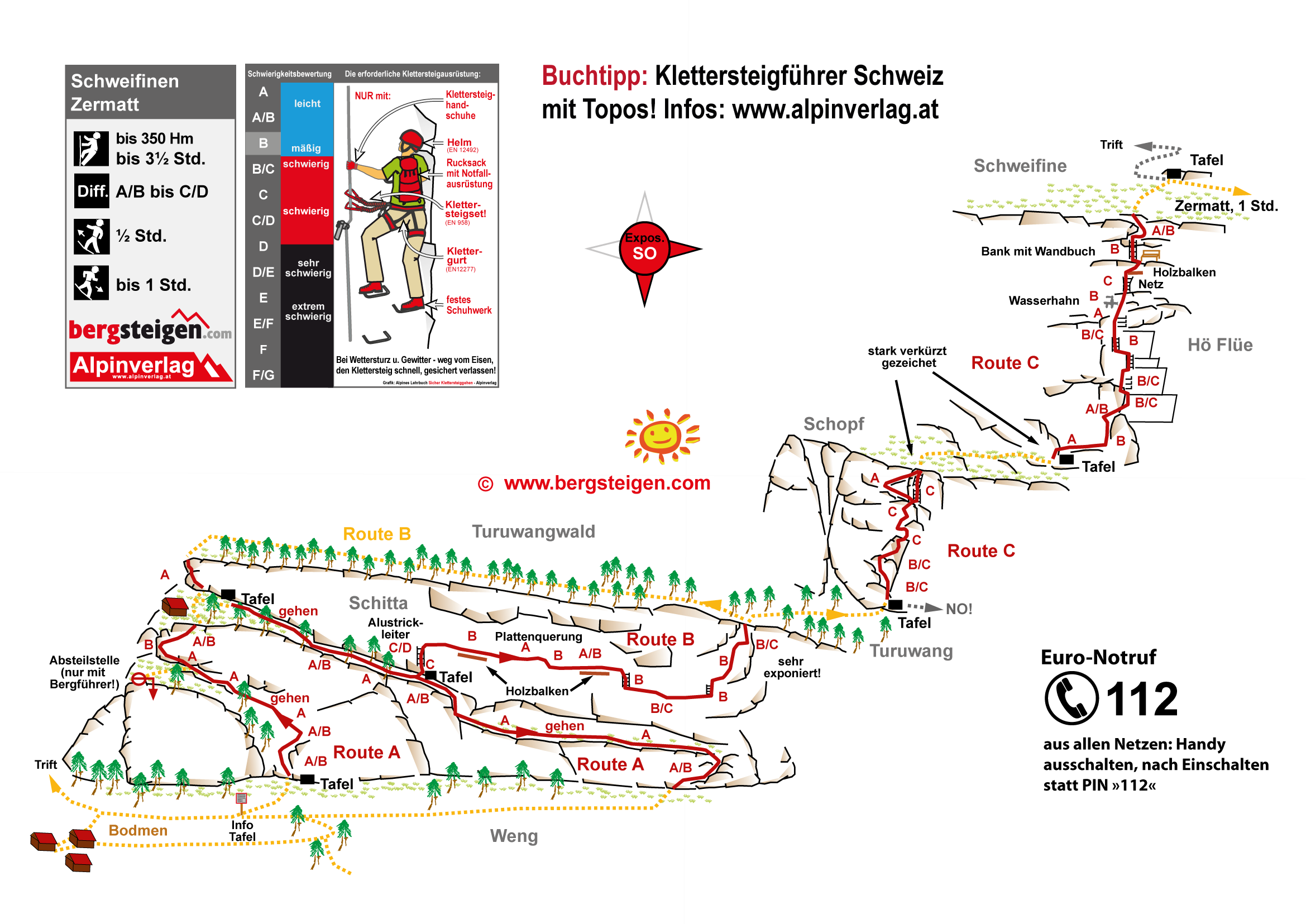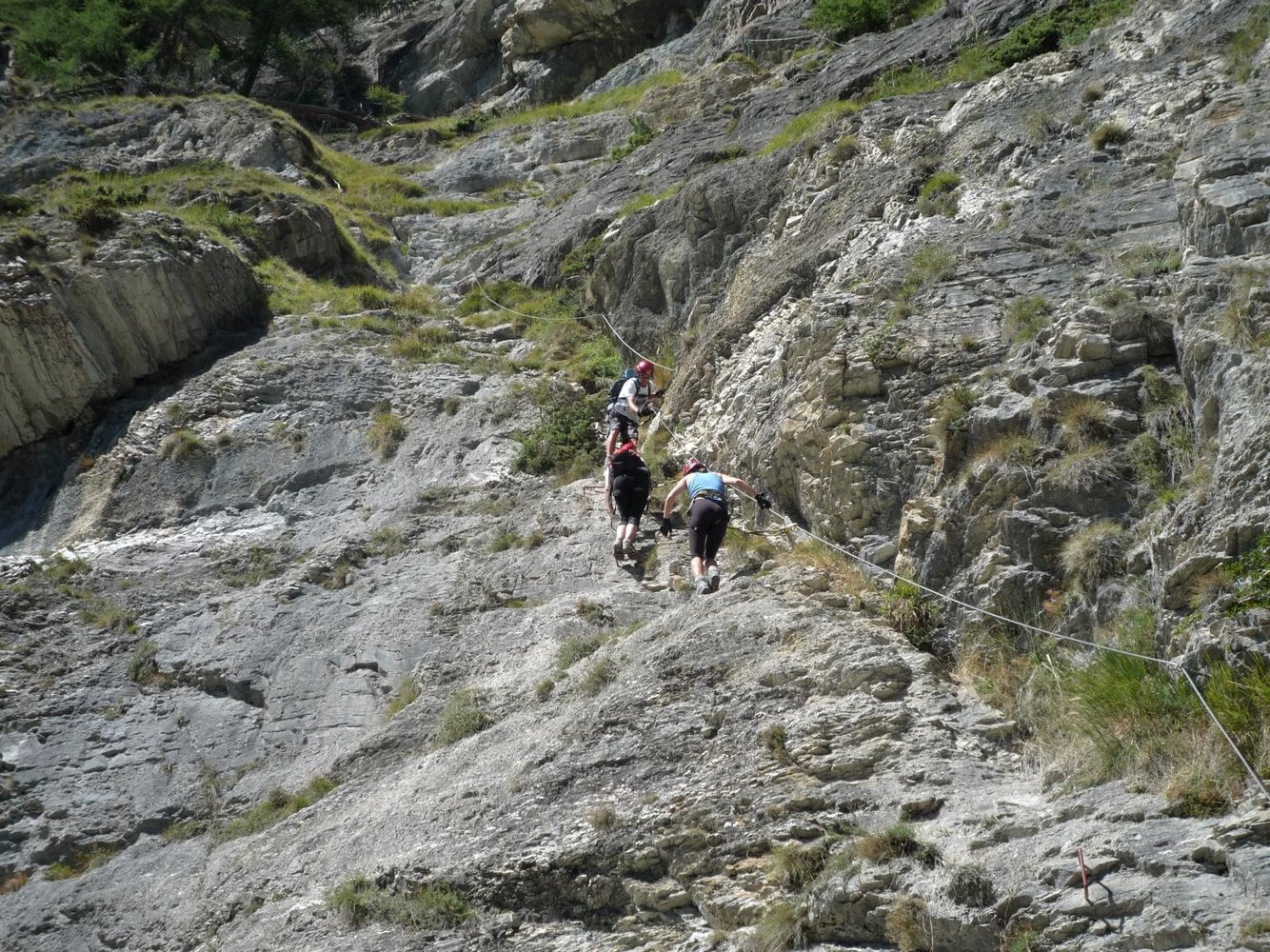 Schöner Steig, dem etwas das alpine Flair fehlt. Wer die Route C macht, sollte deren Länge (ca. 1,9 km) nicht unterschätzen und auch ausreichend Wasser mitnehmen, da es in der Südostwand sehr heiß werden kann und der Wasserhahn am Ende der Route C nur ein Fake ist. In Zermatt gibt es auch einen Adventure-Klettersteig durch die Gornerschlucht zwischen Furi (1867 m) und Zermatt (1616 m). Dort warten neben imposanten Gesteinsformationen (Gletschermühlen, wassergeschliffene Felsen) und donnernden Wassermassen auch drei Abseilstellen, drei Seilbahnen (die längste ca. 80 Meter), ein Pendel und Himalayabrücken. Eine Begehung ist nur mit Bergführer möglich. Info im Alpin Center.
