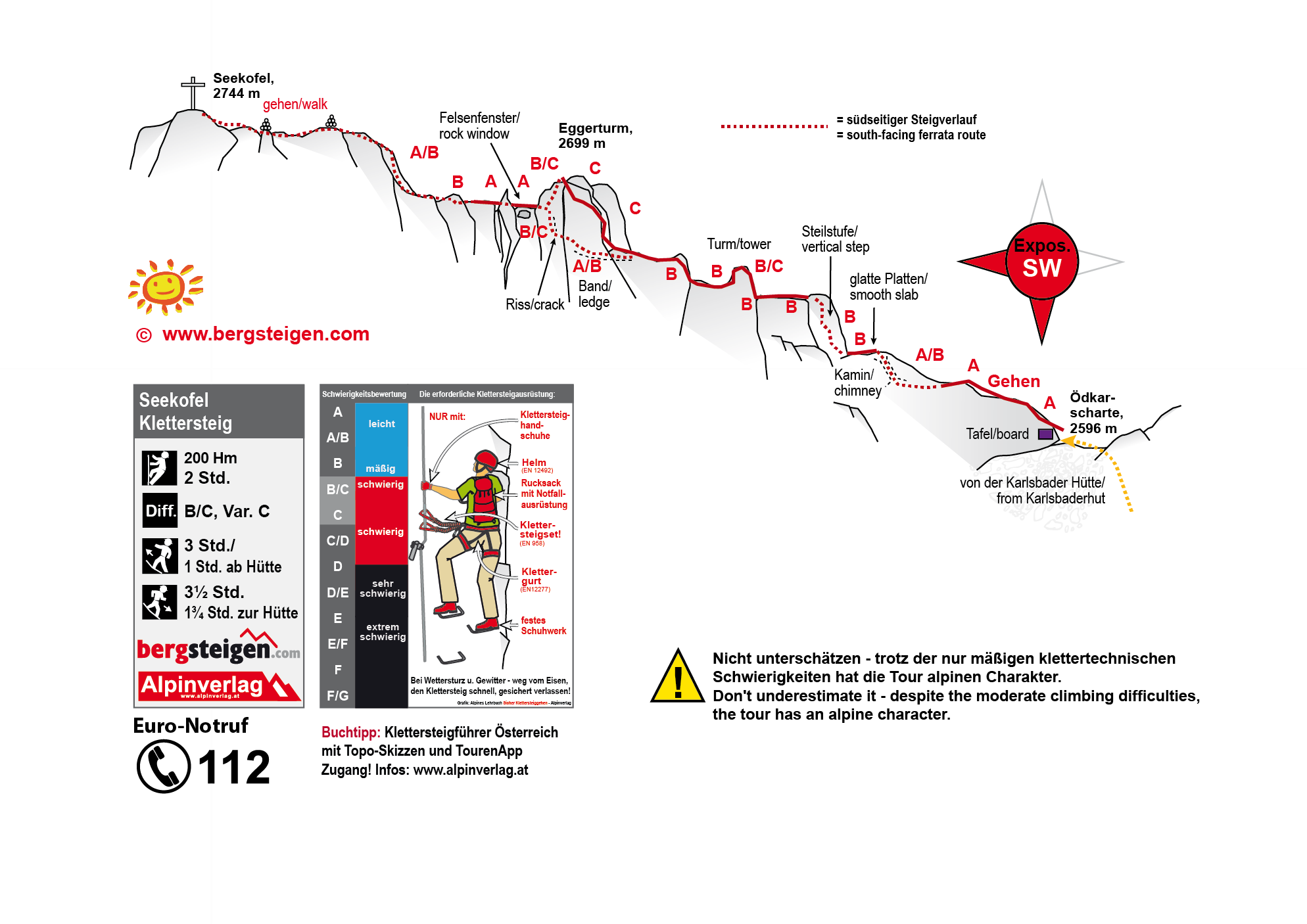 Unterschätzen sollte man die Route nicht, denn trotz der nur mäßigen klettertechnischen Schwierigkeiten hat die Tour alpinen Charakter. Lose Steine und ungesicherte Gehpassagen gibt es ebenfalls. Eine Verlängerung des Steiges wird überlegt - Ausführungstermin noch offen.