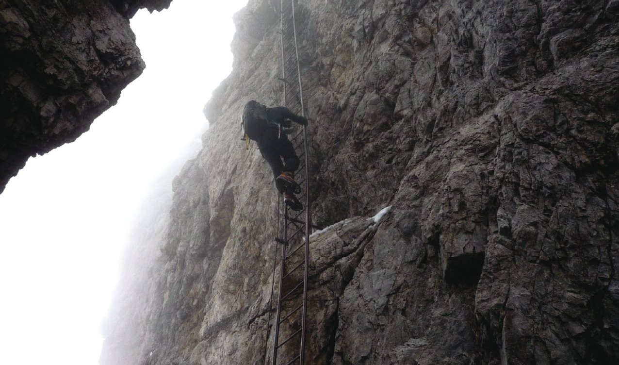 2) Sentiero Oliva Detassis: Von der Tafel sehr steil über eine fast 100 Hm lange Leiternreihe abwärts. Die steilste Leiter ist die Scala degli Dei (C) „Götterleiter“, viele Leitern B, dazwischen gibt es auch die eine oder andere Rastposition. Der kühne Abstieg endet bei einem Spalt.