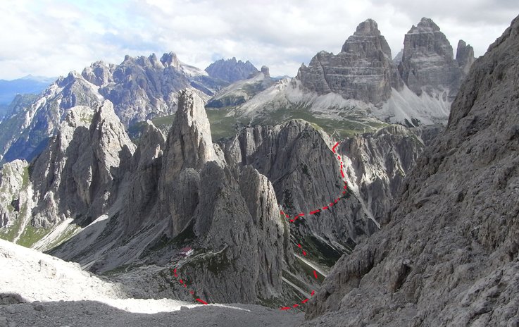 Über Holzstufen mit Seilversicherung (A) in die Forc. de Misurina, 2380 m, aufsteigen und auf der anderen Seite (einmal kurz versichert, A) ins Kar der Cadin della Neve absteigen. Das Kar überqueren (nicht rechts zur Geröllscharte aufsteigen) und in Serpentinen zur Forc. del Diavolo, ca. 2500 m, hinauf. Davor wird eine Felswand durch eine Rinne mit Leitern und Seilen überwunden. Von der Scharte nordseitig ins Geröllkar hinab und unter der Cima Cadin NW zum Rif. Frattelli Fonda Savio queren. Dort kann man die Tour unschwierig über den Weg 115 zum Misurinasee abbrechen,1 ½ Std.. Der Nordteil des Sent. Bonacossa beginnt mit dem Abstieg über eine Felsrampe in die südlichsten Ausläufer des Val della Campedelle, dem man links den Felsen entlang zur Forc. de Rinbianco, 2176 m, folgt. Von der Scharte kurz absteigen und auf das lange, markante Band durch die Ostwände der Cima Cadin de Rinbianco, 2402 m, hinauf. Dem Band folgen und am Ende über eine markante, schotterige Verschneidung (Leitern und Seile A/B) auf ein weiteres Band, das auf das Plateau der Cadinspitzen führt (schöner Zinnenblick). Dem Plateau unschwierig zur Forc. Longeres, 2288 m, folgen und weiter zum Rif. Auronzo. Um den Trubel beim Rif. Auronzo zu meiden, kann man schon von der Forc. Longeres absteigen.