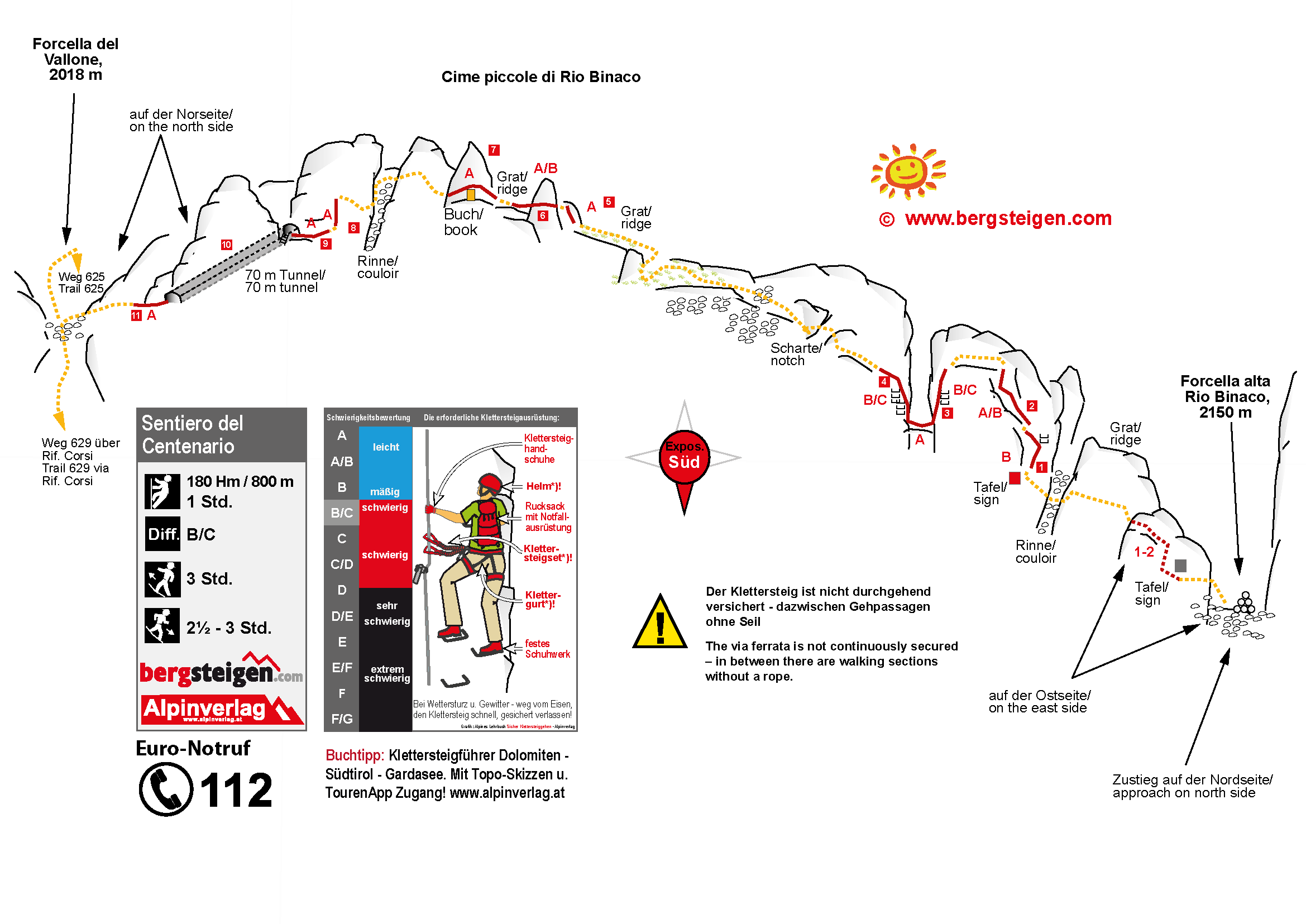 Der Sentiero del Centanario (Jubiläumsweg zum hundertjährigen Bestehen der Sektion Gorizia des CAI im Jahr 1983)ist ein landschaftlich superschöner Klettersteig mit historischem Flair. Höhepunkt des Klettersteigs ist der 10. Abschnitt, wo man über einen Tunneleingang in eine Geschützkaverne gelangt, um anschließend über einen weiteren Tunnel den Berg tiefer unten nordseitig wieder verlässt. Mit ca. 800 Metern Länge und etwa 150 Höhenmetern Differenz zählt er sicherlich nicht zu den längsten Klettersteigen der Julischen Alpen, jedoch ergibt sich aus Zustieg und Abstieg eine nicht zu unterschätzende Tagestour. Sehr empfehlenswert!