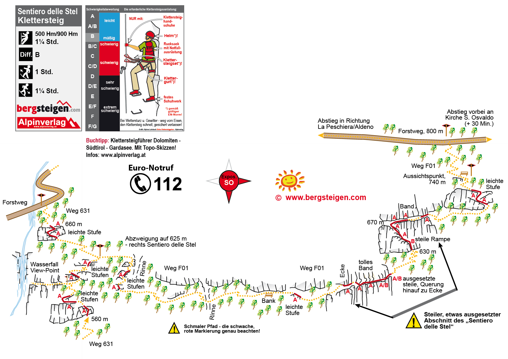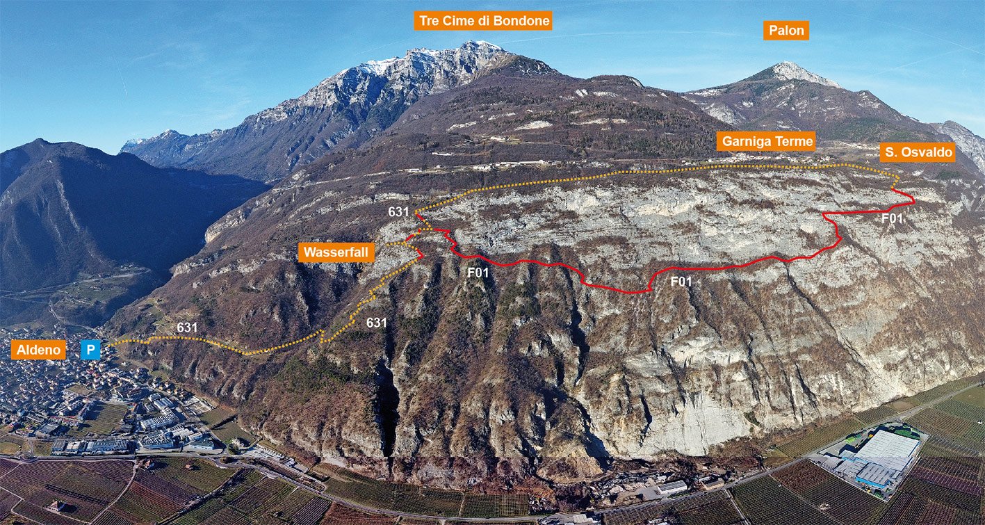 Siehe Topo: Man steigt von Aldeno auf dem Wanderweg 631 in Richtung La Peschiera auf. Auf der Höhe von 625 m (oberhalb der Abzweigung zum Wasserfall) zweigt rechts der Sentiero delle Stel ab. Man folgt dem schwach rot markierten Pfad (etwas Spürsinn für die richtige Route ist nötig!). Kurz vor dem Ende kommt man zu einem ausgesetzten Band (A) und einer steilen Ecke (A/B), nach einer Gehpassage kommt man zu einer steilen Rampe (B). Im Zickzack wird die Felswand überwunden (Stellen A/B) und man steht am Ende bei einem Aussichtspunkt mit Bank (740 m). Weiter aufwärts zu einem Forstweg - links zurück in Richtung La Peschiera und davor nach Aldeno absteigen oder auf dem Forstweg nach rechts zur Kirche S. Osvaldo in Garniga Terme (ca. 30 Minuten Mehraufwand).