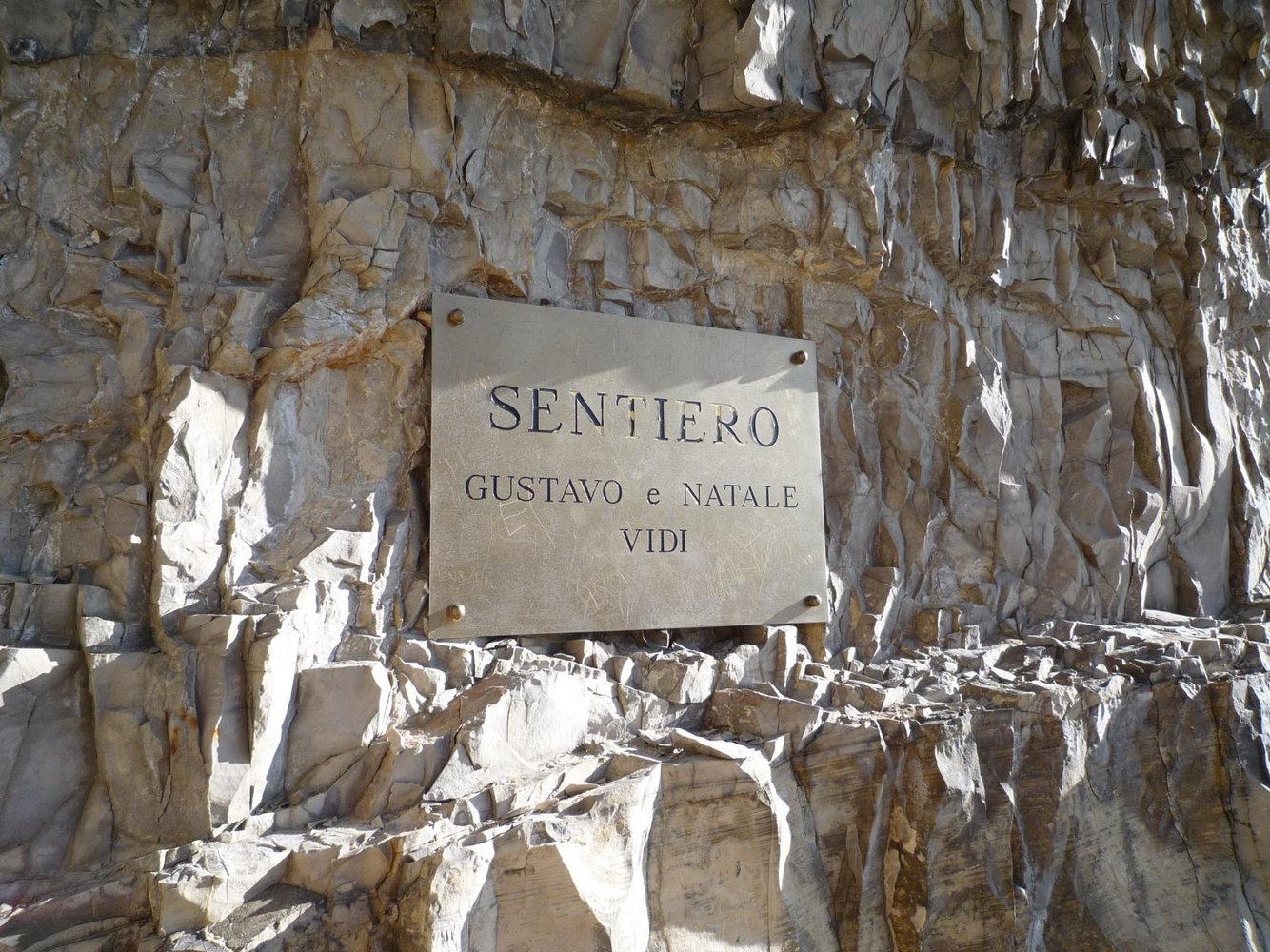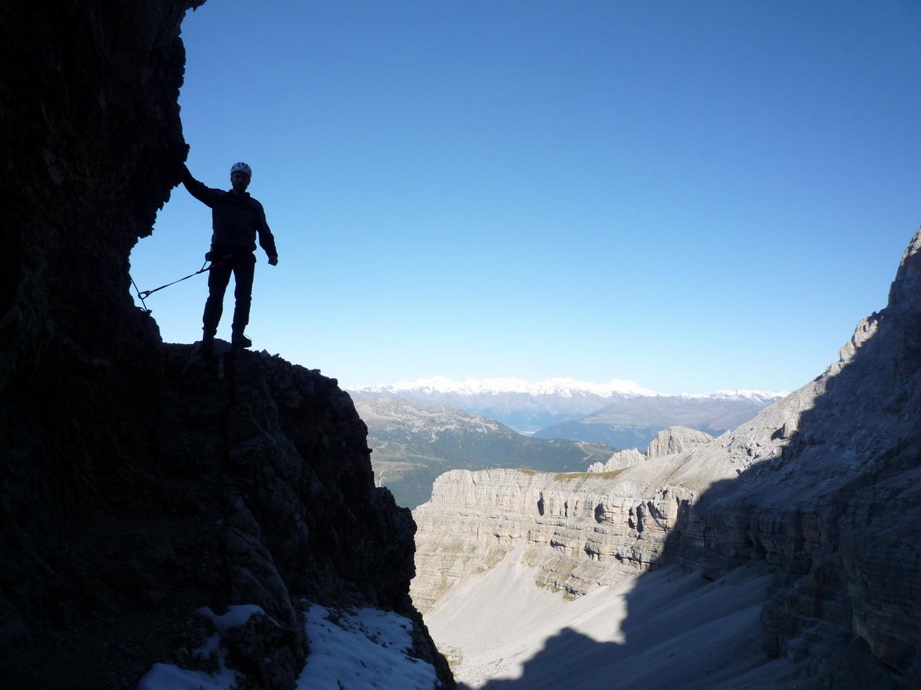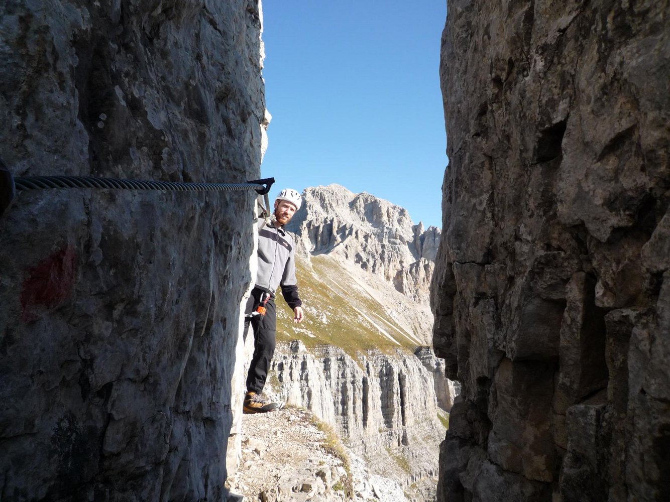 Über Blöcke in einem markanten Spalt, und dann unversichert auf dem Grat bis zum Steinmann, der den Wechsel auf die Südwestseite signalisiert. Leicht absteigend hinab zu den ersten drei Leitern bei einem Felsenfenster, über diese (A/B) zur nächsten Querung (A) und über eine letzte Leiter in eine Rinne und zur Felsnische mit Bank absteigen (A) (Ende der Versicherungen). Von dort unversichert über das markante Band zum Sperone degli Orti, 2517 m, mit Abzweigung des Sentiero Claudio Costanzi (Wegweiser N46.23044, E10.89007).