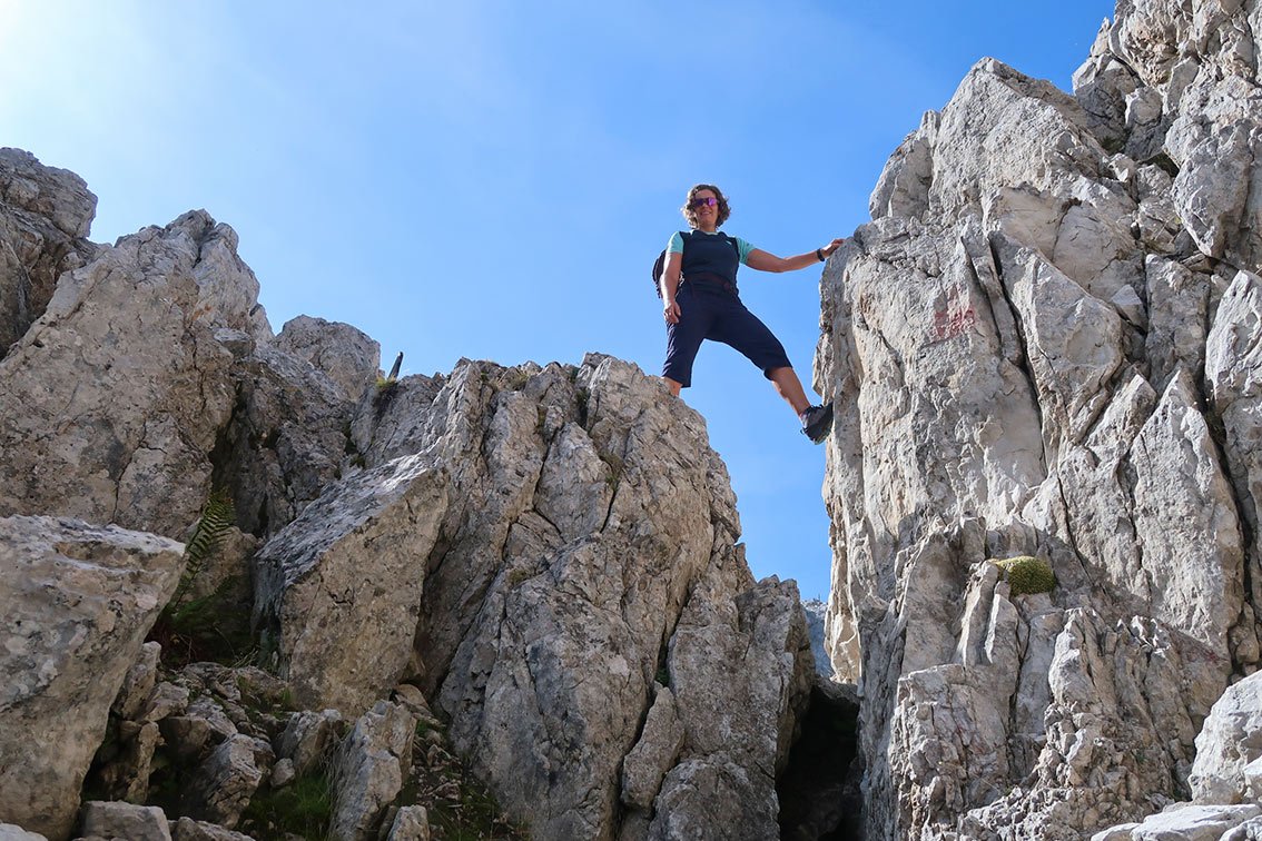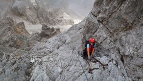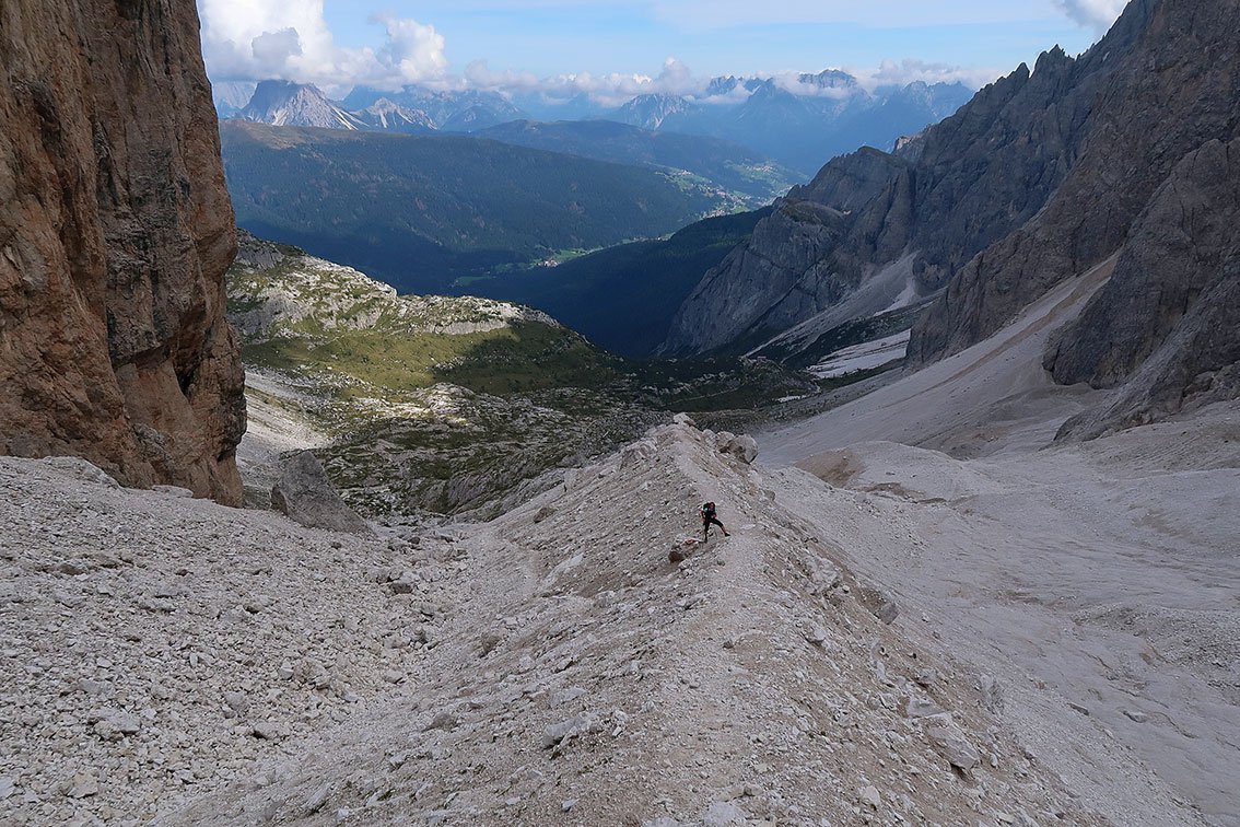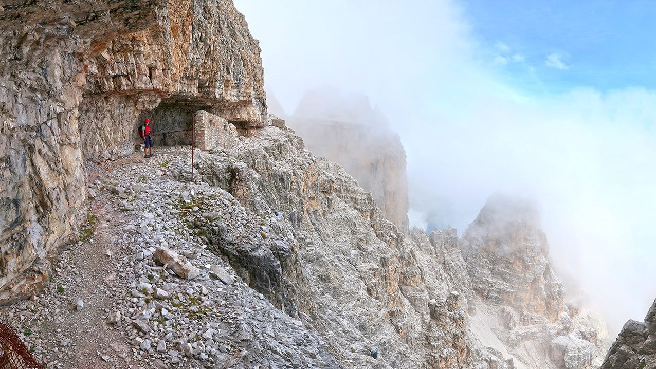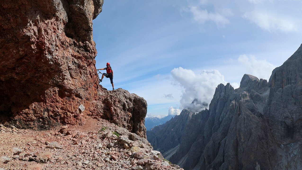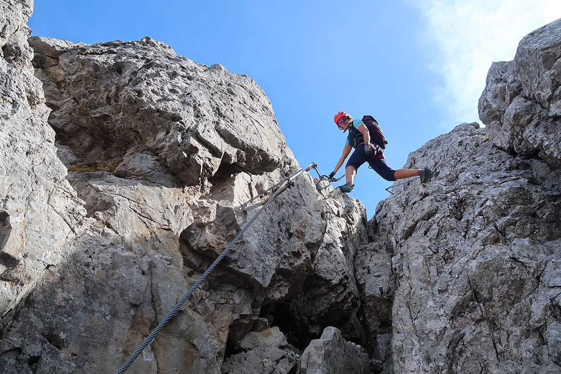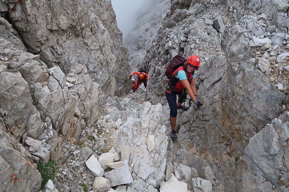 Die Ferrata Zandonella (Süd) ist steil und hat Stelle C, der Rotwandsteig ist einfach, mit Stellen A/B und viel Schrofengelände.
