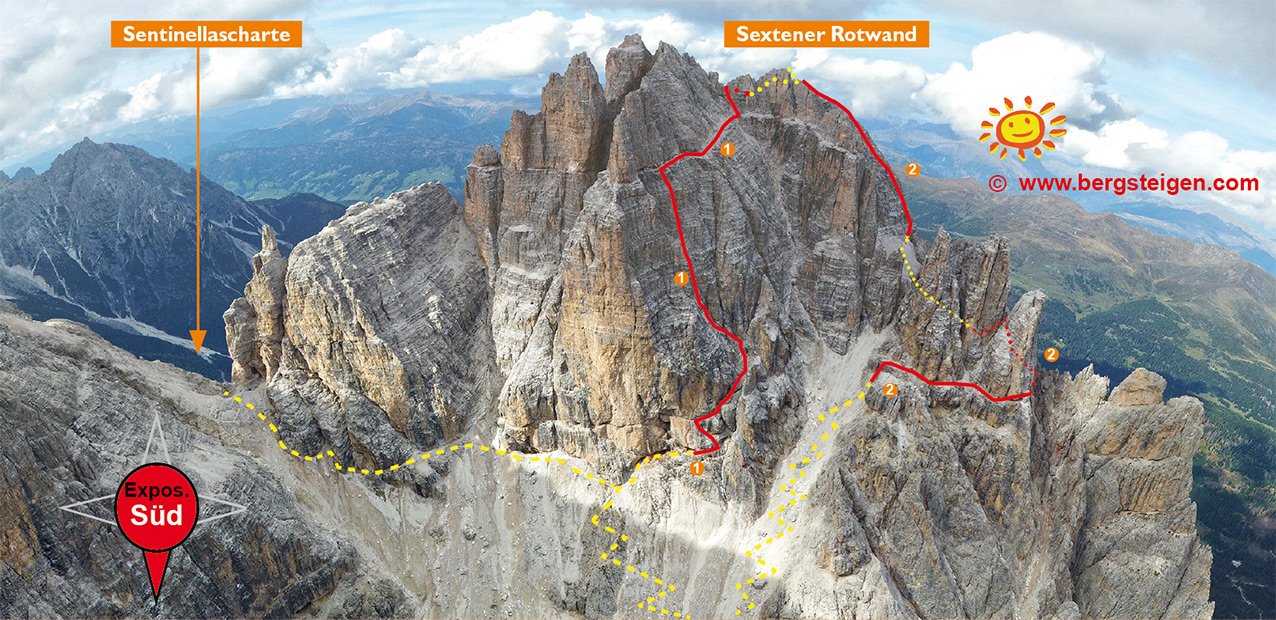 Siehe Topos Sextener Rotwand Klettersteig bzw. Zandonella Klettersteig. Dort gibt es auch jeweils eine verbale Beschreibung.