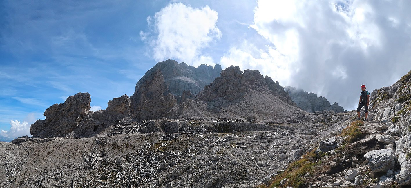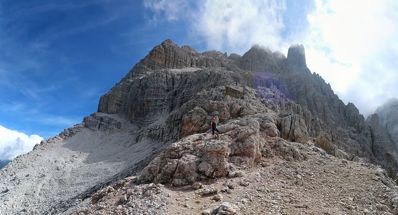 Die Sextener Rotwand Überschreitung ist die Kombination der Ferrata Zandonella und dem Rotwandsteig. Beginnend vom Kreuzbergpass steigt man entweder zuerst entlang der Ferrata Zandonella bis auf den Gipfel der Sextener Rotwand (2936 m) und von dort auf der Nordwestseite auf dem leichtern Rotwandsteig ab - man kann die Überschreitung aber auch andersherum machen und auf dem Südost-Klettersteig (Circolo Est) an der Südseite absteigen. Im Grunde ganz egal wie man es macht, es kommt eine recht lange Bergtour heraus - der Reiz ist nicht der Klettersteig an sich, sondern das Gesamterlebnis, bei dem man neben atemberaubender Landschaft auch viele Kriegsschauplätze des Ersten Weltkrieges sieht. Eine wirklich tolle Rundtour, bei der man final auf einem der bekanntesten Dolomitengipfel steht und am Ende des langen Tages auch in den Beinen spürt, wie viel Strecke man zurückgelegt hat.