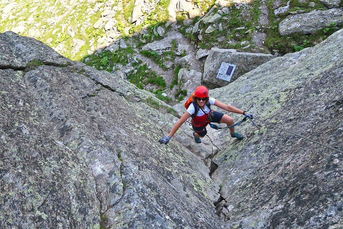 Komplette Klettersteigausrüstung und Helm; für Schwächere evtl. ein kurzes Sicherungsseil.