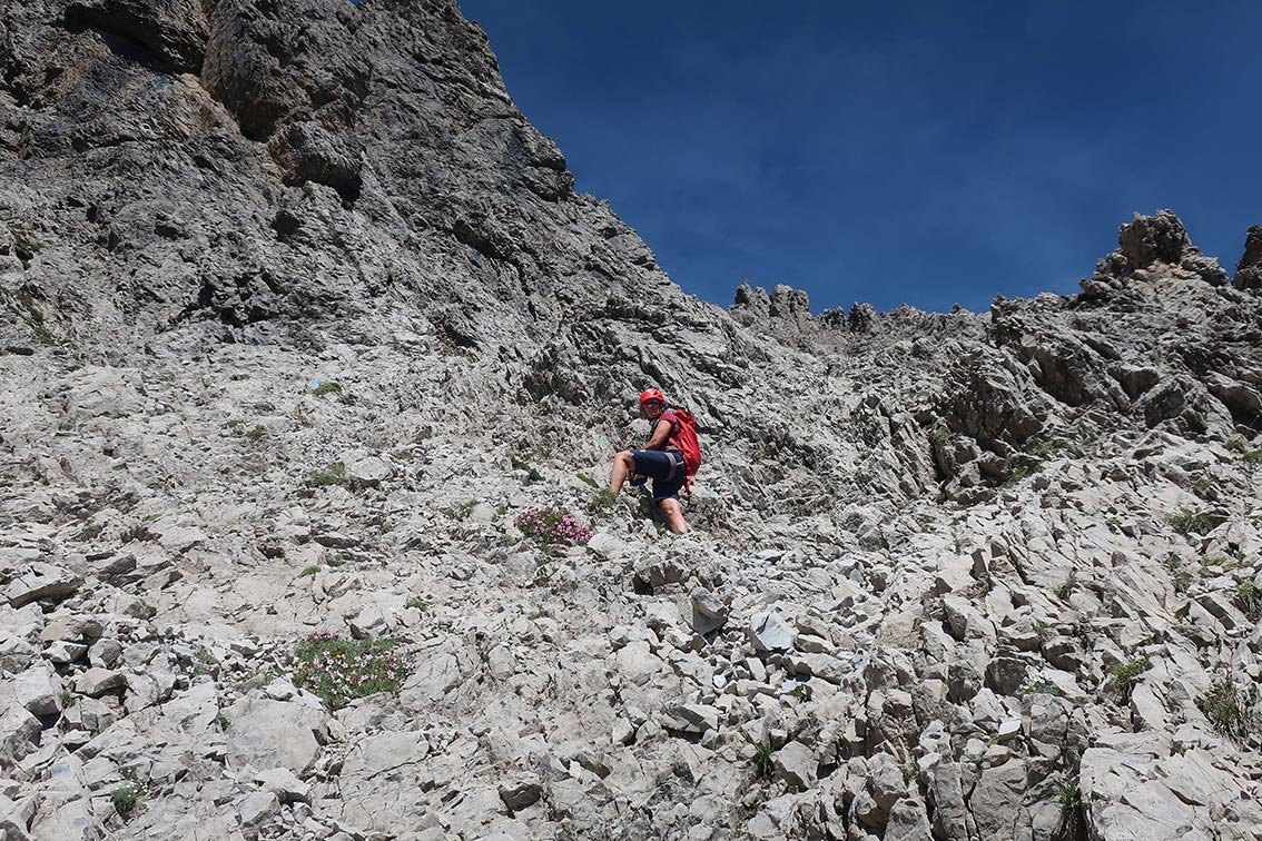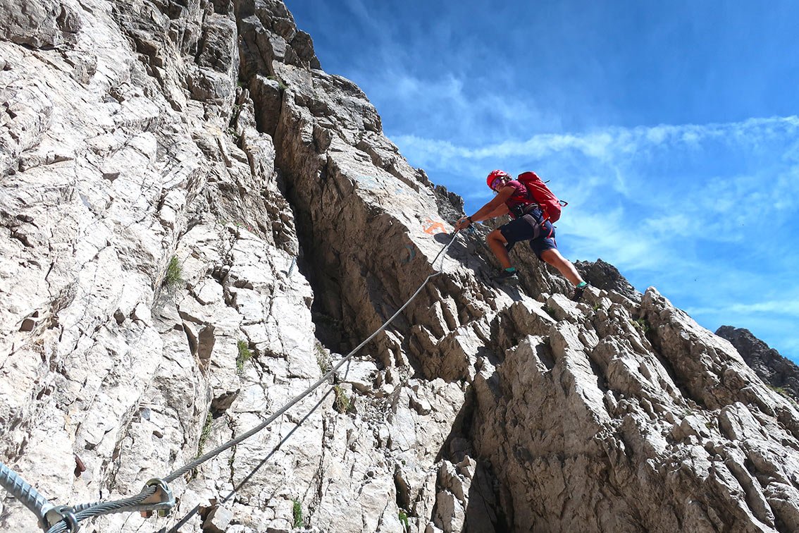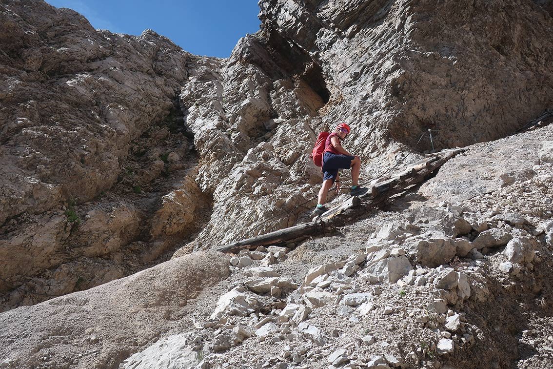 Der Spitzkofel Steig ist nicht durchgehend mit Stahlseilen versichert, sondern nur an den steilsten Stellen. Im leichteren Gelände ist Trittsicherheit erforderlich.