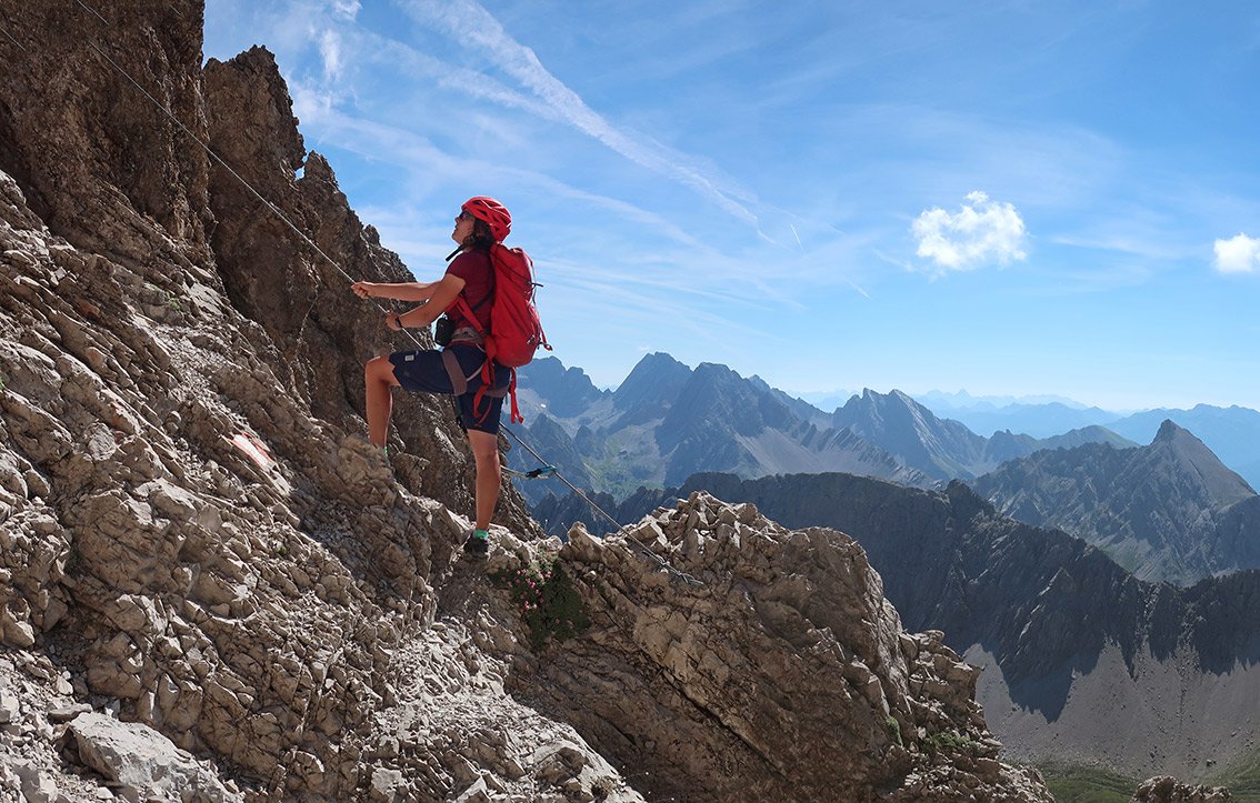 Komplette Klettersteigausrüstung und Helm. Für Unerfahrene ein Sicherungsseil.