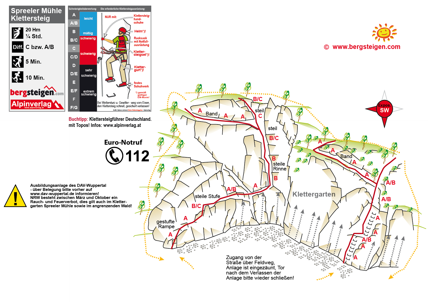 Beim Mini Klettersteig Spreeler Mühle handelt es sich um einen kurzen Übungsklettersteig, welcher vom DAV-Wuppertal in einem kleinen Steinbruch angelegt wurde. Es gibt dort auch einige Klettertouren, deshalb wird der Steinbruch auch "Klettergarten Spreeler Mühle" genannt. Da der DAV das Gelände vor allem an den Sommerwochenenden als Ausbildungsstätte nutzt, meidet man am besten diese Stoßzeit. Infos zur Kursbelegung gibt es auch auf der DAV-Wuppertal Webseite.