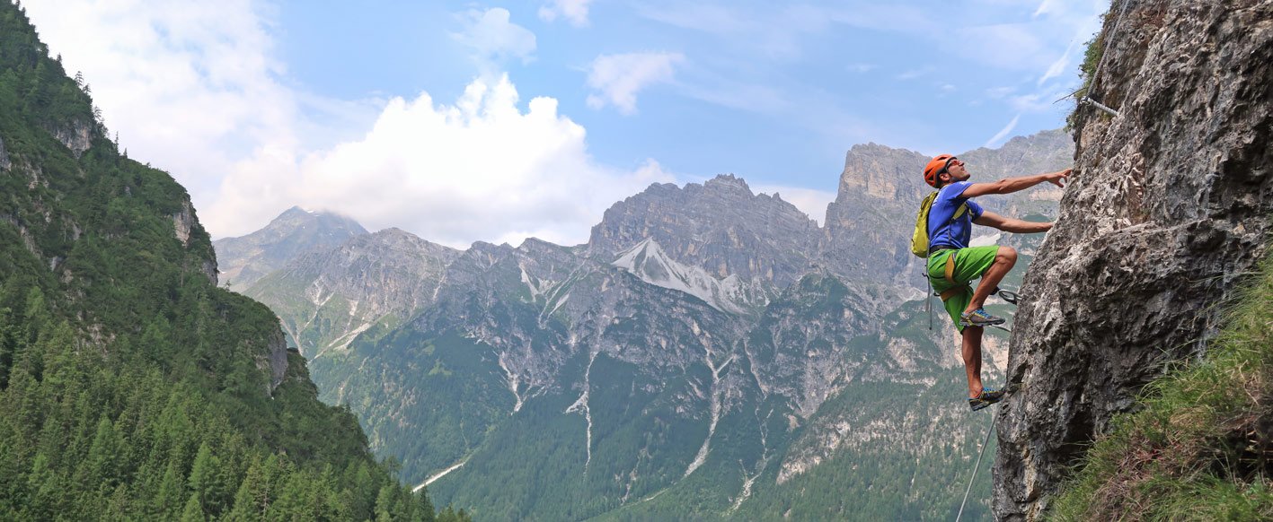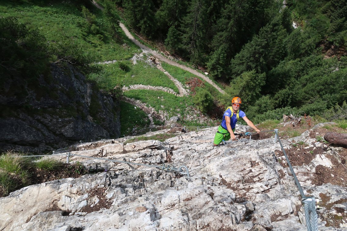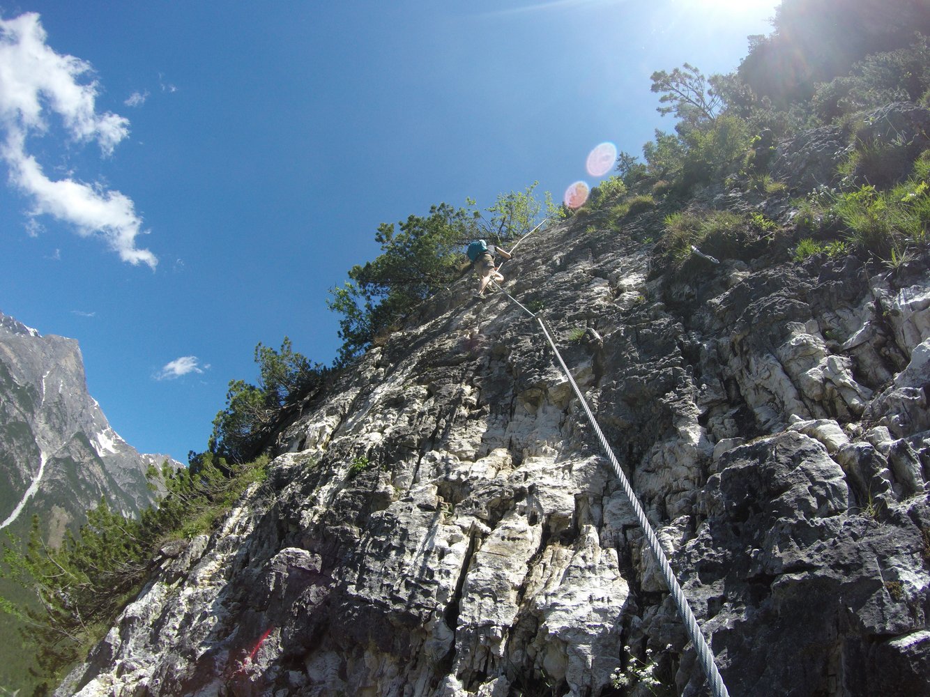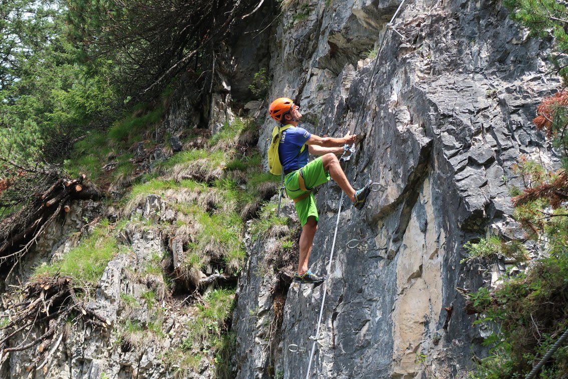Klettersteigausrüstung und Helm. Für Kinder evtl. ein Sicherungsseil.