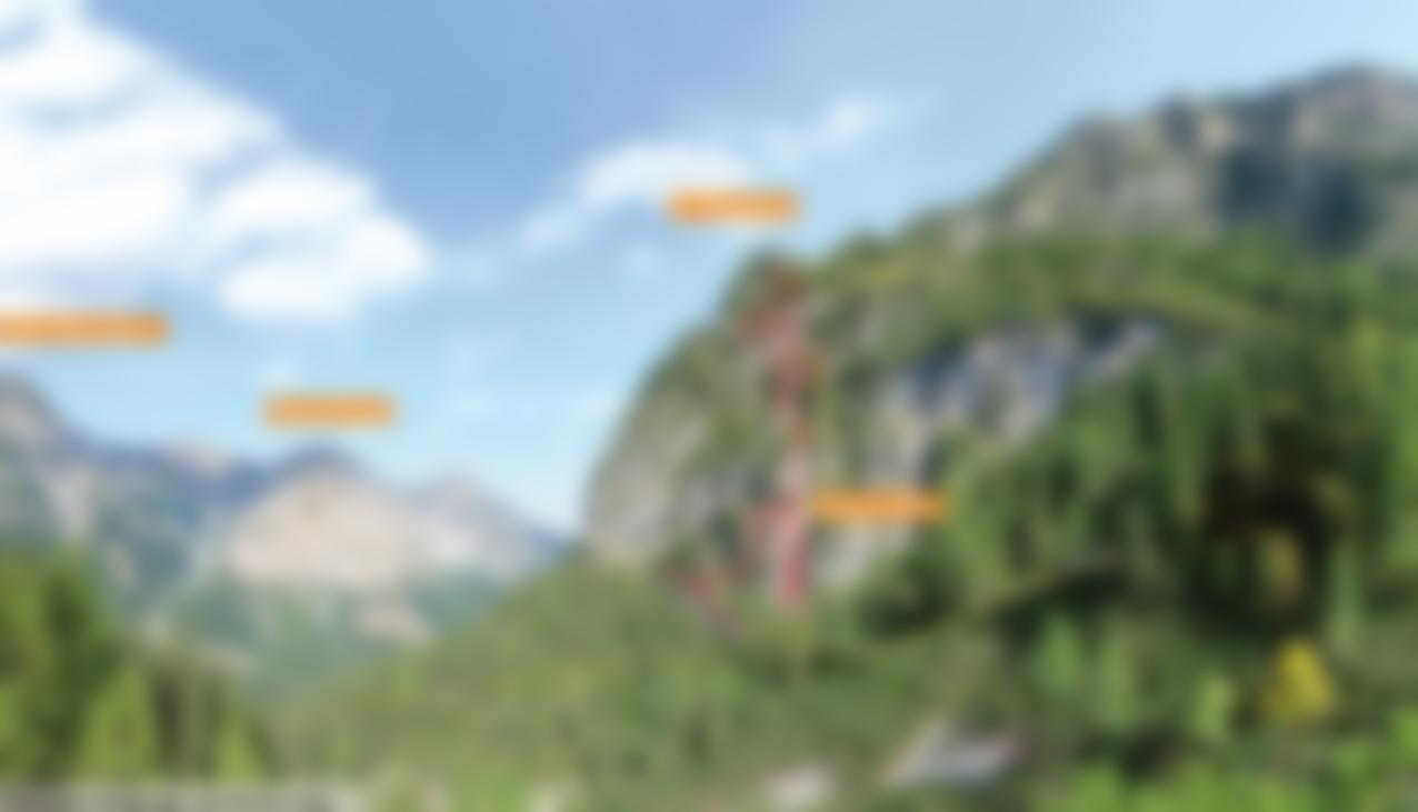 Siehe Topo. Es gibt unten 6 verschiedene Möglichkeiten, um über die erste Steilwand hinauf zum "Habicht Blick" (Aussichtspunkt) zu gelangen. Klettersteige von A-E und einen "Schwarzen Bergweg" (welcher gleich schwer und ausgesetzt ist wie der Klettersteig mit Schwierigkeit A). Vom Habichtblick hinauf zur Kapelle St. Magdalena (C-Passage, meistens B).