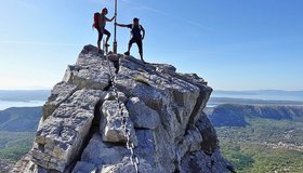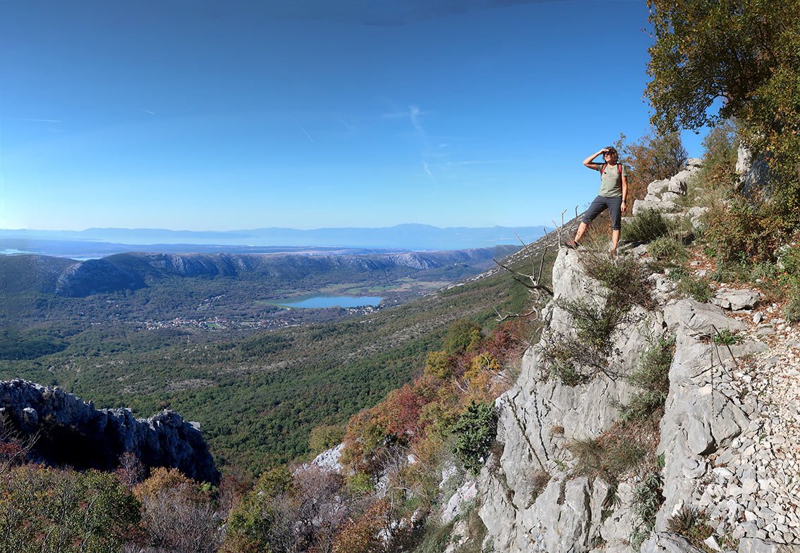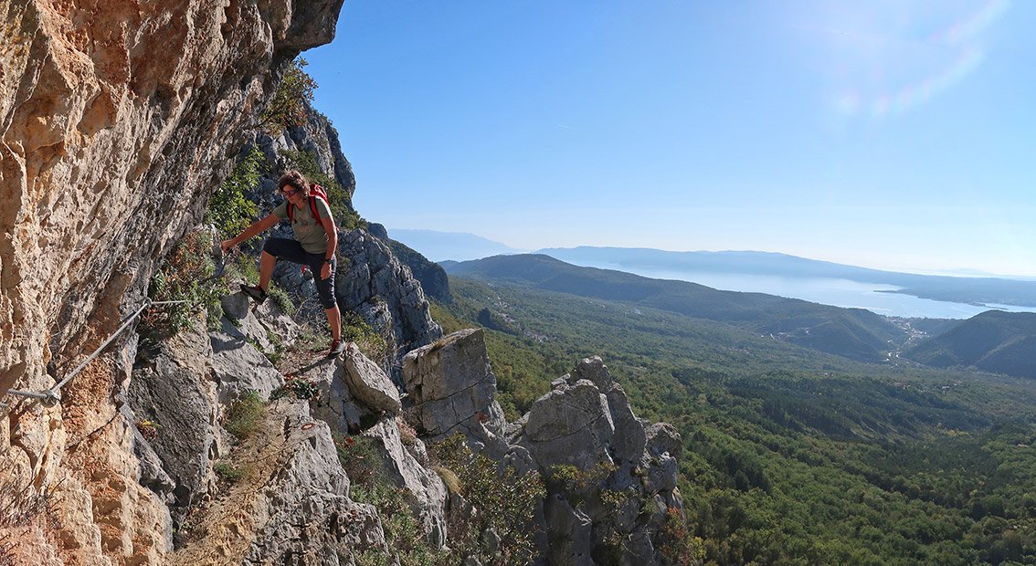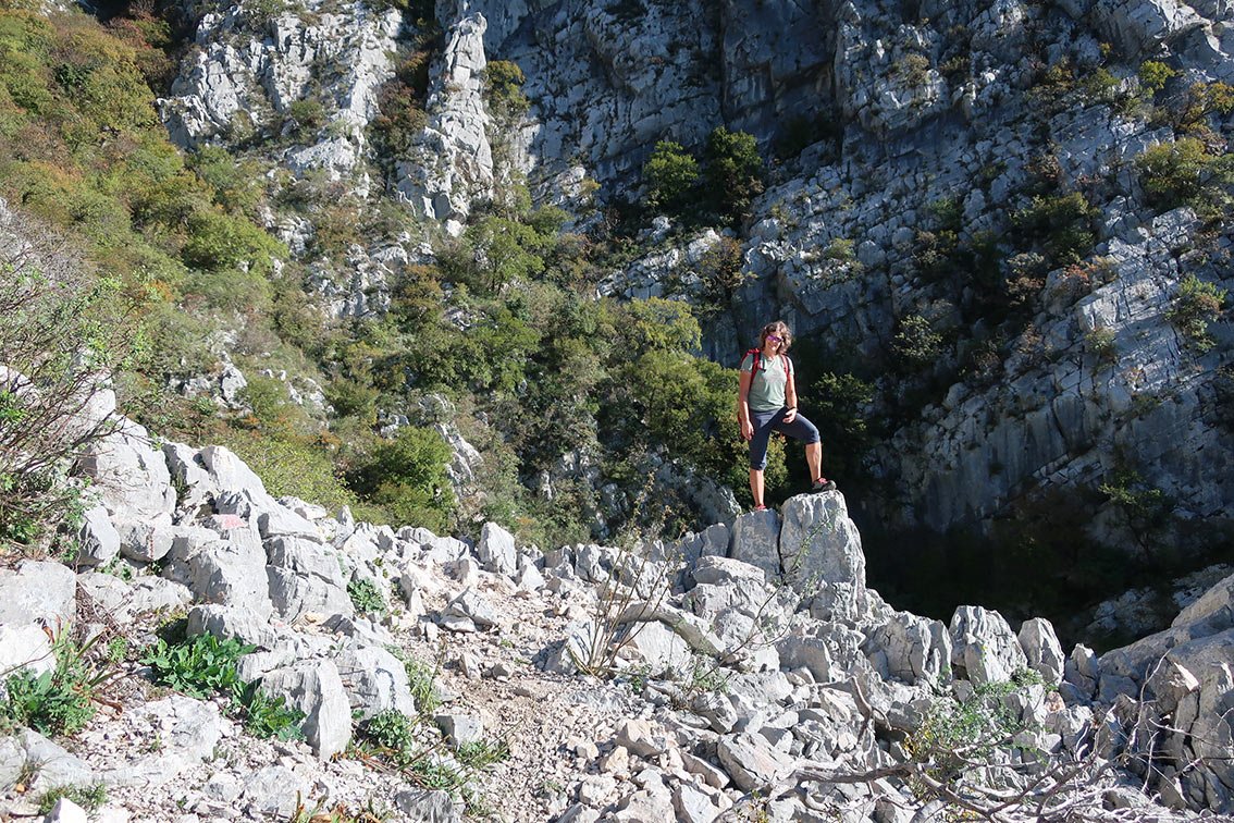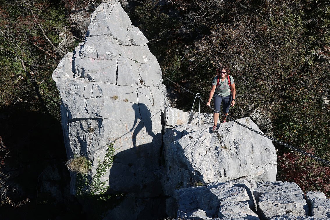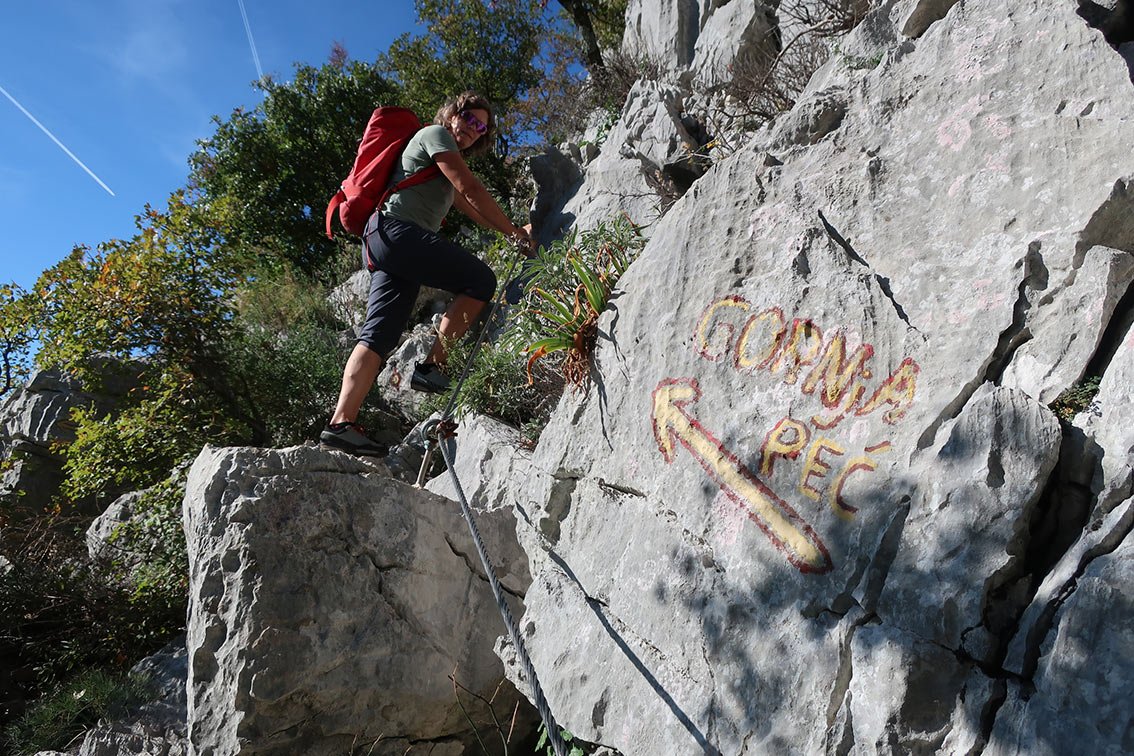 Der Staza Kamenih Stupi ist genau genommen ein Rundweg, von dem kurze, seilgesicherte Varianten abzweigen. Oben auf dem Plateau kann man den Kuk Baba (573 m) mit einbauen, das ist für Klettersteiggeher das bessere Highlight (entlang einer Kette auf einen steilen Felszapfen), in der breiten Schluchtrinne den mit Stahlseil gesicherten Abstecher zu den beiden Höhlen. Wer in der Gegend ist, kann diese schöne Rundwanderung (wir sahen Schlangen, frei laufende Pferde und sogar die mächtigen Gänsegeier (Gyps fulvus) über uns beeindruckend in der Thermik kreisen) in seinen Urlaub einbauen - reine Klettersteiggeher werden aber keine Freude damit haben.