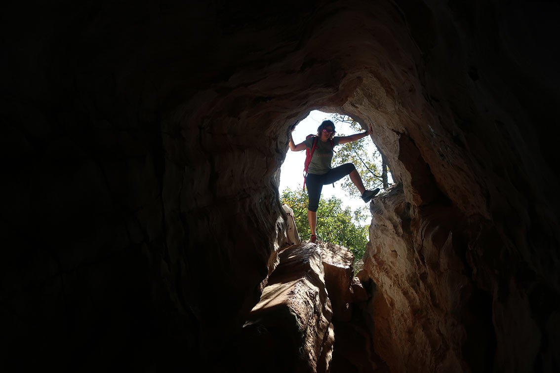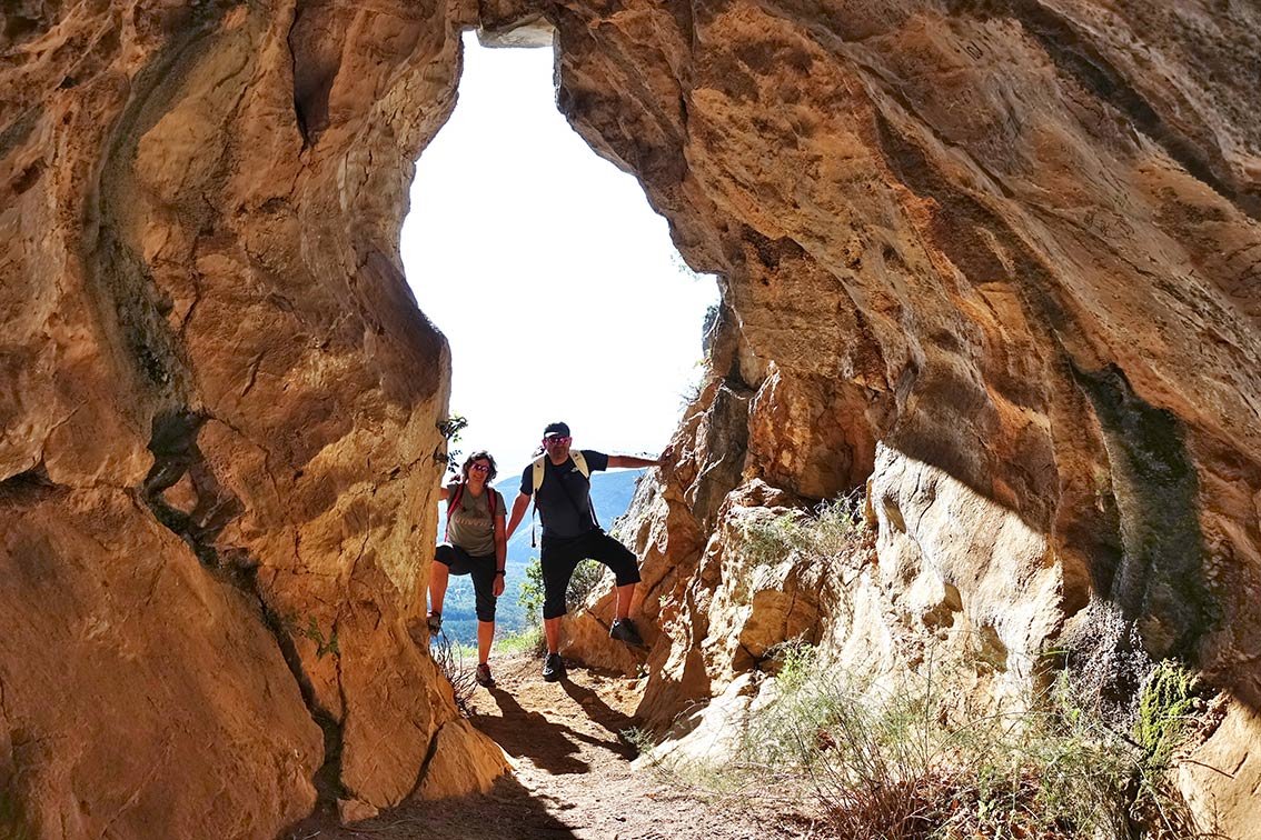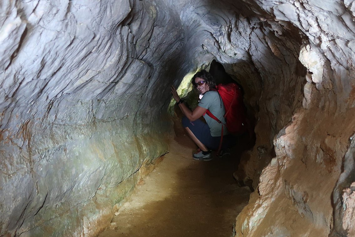 Man geht wieder auf den Querweg zurück, folgt diesem weiter nach Süden bis ein Pfad (Holztafel Staza Kamenih Stupi) rechts abzweigt. Man geht auf dem Pfad in einer weiten Felsschlucht bergab. In der Mitte des Abstieges (ca. 470 m) zweigt rechts ein Pfad zu den beiden Höhlen (Stein mit Aufschrift Cave, 80 m) ab. Man gelangt zu den Seilsicherungen und kann die beiden Höhlen anschauen. Wieder zurück auf dem Steig geht es weiter bergab, unten dann rechts auf dem Asphaltweg direkt zum Ausgangspunkt mit dem Brunnen.