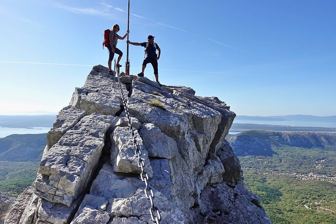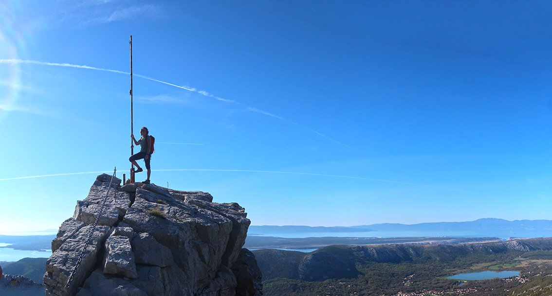Man folgt vom Brunnen der Asphaltstraße in Richtung Norden bis man zur Abzweigung (Stein mit Staza Kamenih Stupi) stößt. Dort rechts dem Pfad (teilweise auf Steintreppen) bis auf das Plateau folgen, wer will, kann dort links ca. 30 Minuten (hin und zurück) zum Aussichtspunkt Pridva gehen. Man hält sich aber besser rechts und folgt dem markierten Weg auf dem Plateau nach Süden. Auf einem unscheinbaren Flachstück zweigt ein markierter (rot, gelb) Pfad in Richtung Felskante ab. Man folgt diesem Pfad, auch kurz absteigend, bis zur Felskante. Dort klettert man entlang der Kette auf den Kuk Baba (573 m).