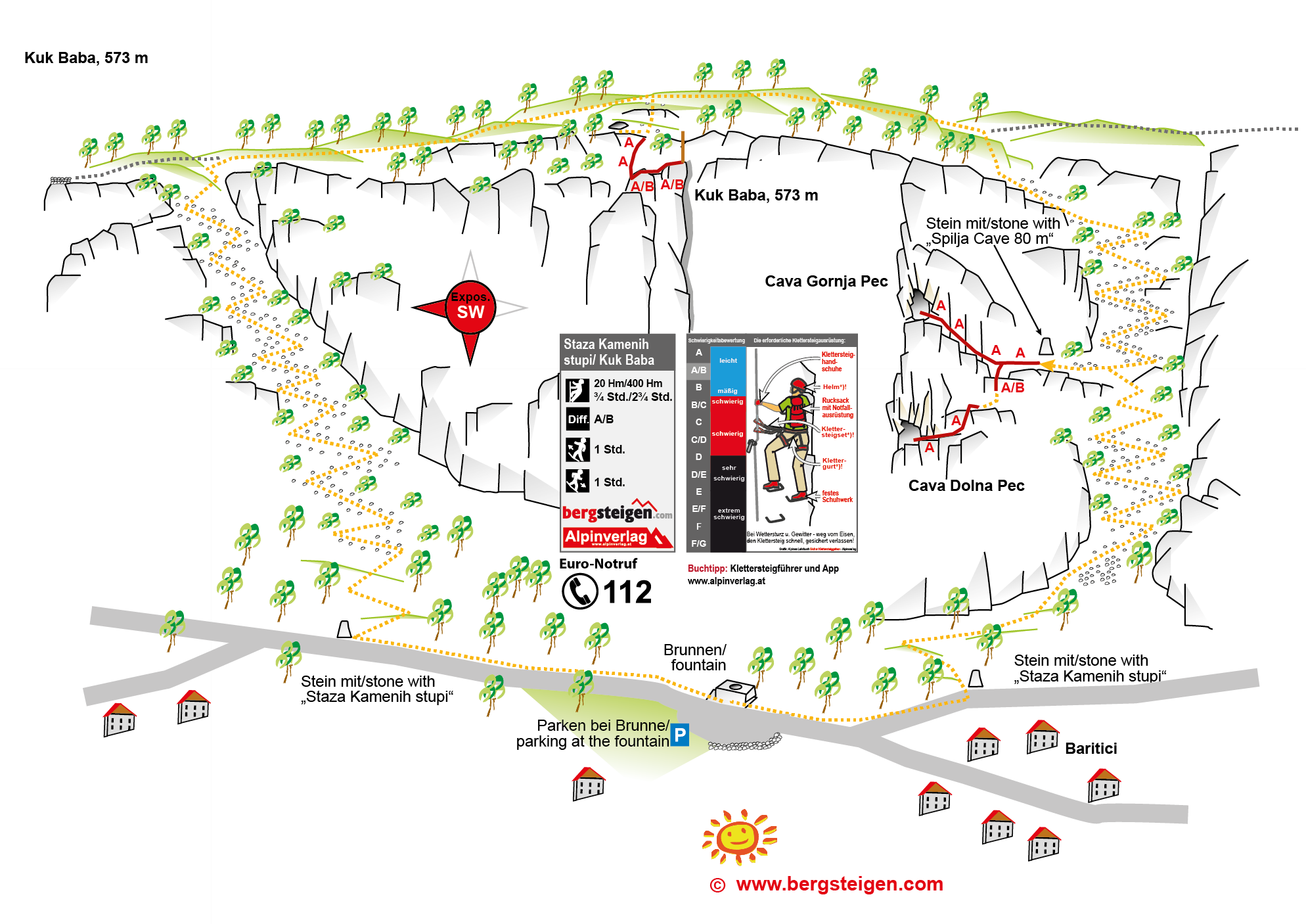 Siehe Topo. Der Übergang zum Kuk Baba ist recht ausgesetzt mit einer Passage A/B. Das Seil zu den Höhlen ist ganz kurz A/B (meist A).