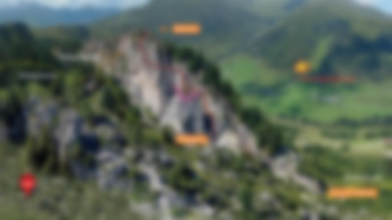 (A/B) und weiter zu zwei Seilbrücken. An deren Ende gerade die Wand hoch (A/B) und kurz vor dem Ausstieg über eine Leiter. Am Grat zum Gipfelkreuz. Abstieg wie Steinbock-Klettersteig.