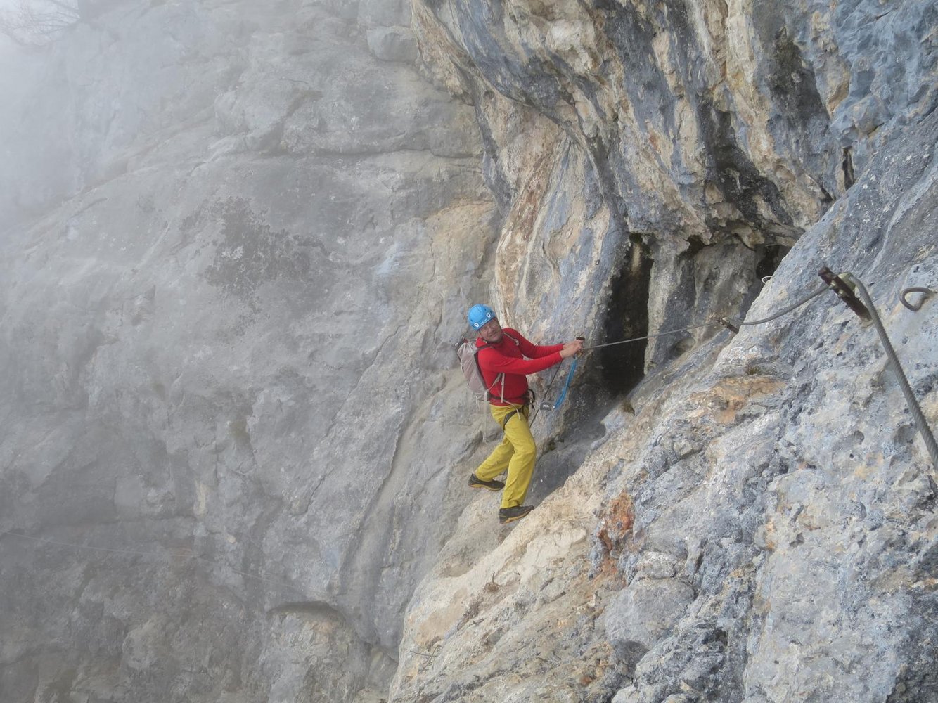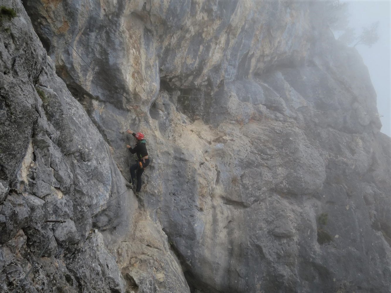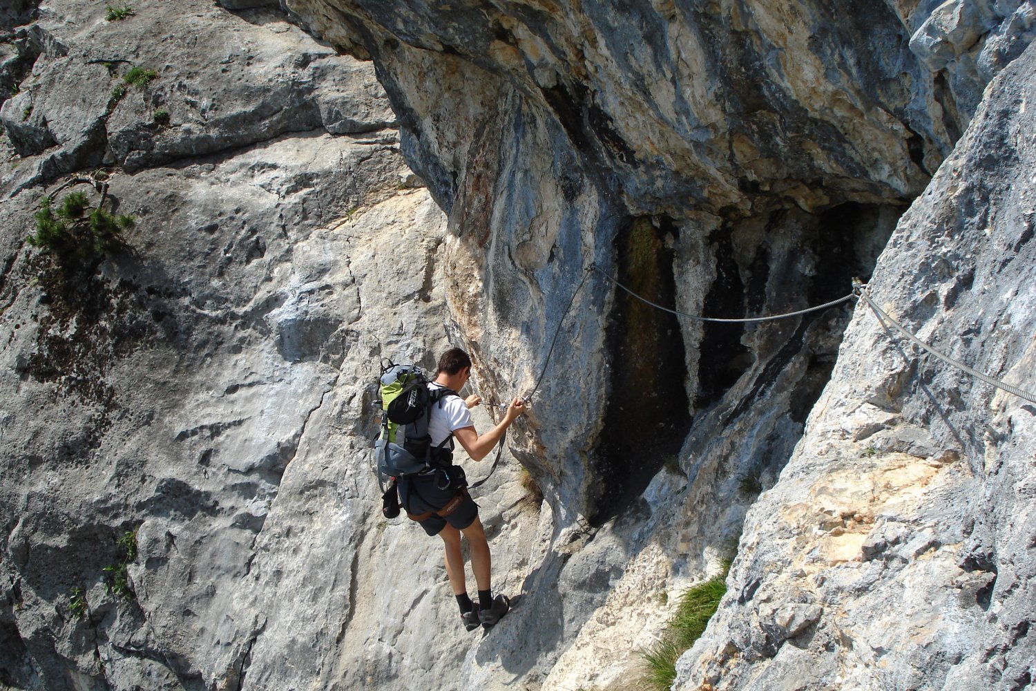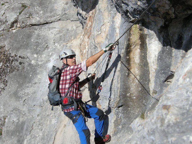 Vom Einstieg ca.. 100 Meter waagrecht und auch kurz leicht absteigend nach links (A, A/B und eine kurze Plattenstelle im Abstieg B) unter eine überhängende Wand bei der sich der Klettersteig nach rechts und links gabelt.