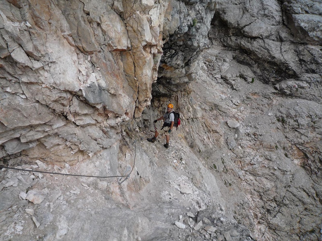Die Versicherungen leiten durch eine steile Rinne (B) auf ein Grasband, dem man zu einem Felsaufschwung folgt, der gut versichert (B) zur Forc. di Mescol, 2370 m führt. Auf der Westseite über Wiesenhänge zu einer kurzen erdigen Rinne absteigen, durch diese versichert (A) in den großen, mit Blöcken übersäten Kessel der Meduce di Dentro hinab. Am linken Rand der Blöcke (nicht leicht zu fi nden) entlang zu den Osthängen der Croda Rotta, durch die eine markante Schuttrinne zieht, die in halber Höhe durch eine mit 9 Leitern bestückte Felsstufe unterbrochen wird (A/B). Nach der Leiternpassage gelangt man im oberen Teil der Rinne hinauf zur Forc. Croda Rotta, 2590 m. Auf der Westseite NICHT absteigen, sondern nach links (kurz versichert A) in eine kleine Scharte mit Felsturm queren. Dann über anfangs steiles Geröll hinab und linkshaltend zu einem Rücken, den man bis zu einem markanten Felsblock weiter absteigt. Dort leiten Versicherungen steil (B) in die Enge Scharte der Forc. d. Vanedel, 2372 m. Auf der anderen Seite der Scharte warten eine kurze Leiter (B) und Versicherungen (B), die auf einen Plattenrücken führen. Danach leichte Kletterei (max 1) und Versicherungen (bis B), bis man auf dem Rücken links der Schlucht auf den Wiesenboden absteigt. Es folgt eine Linksquerung zu einem Felseck, welches man luftig aber leicht (A/B) überwindet. Zu Fuß weiter zum Talboden des Val Grande queren – oben am Hang ist klein das Biv. Voltolina zu erkennen. Der Weg 280 folgt nicht dem Talboden – dort ist über den Weg Nr. 278 ein Schnellabstieg ins Val di San Vito möglich (kurz versichert, B; Vorsicht bei Nässe!) – sondern steigt sanft auf der anderen Talseite zum markanten Cengia del Doge auf. Das immer enger werdende Schuttband führt zu einem exponierten Eck, wo Versicherungen über die steilsten, erdigen Stellen helfen (A, Trittsicherheit!). Danach wird das Band wieder breiter und es geht gemütlich zur Wegkreuzung mit dem Weg 226 ins Val di San Vito.