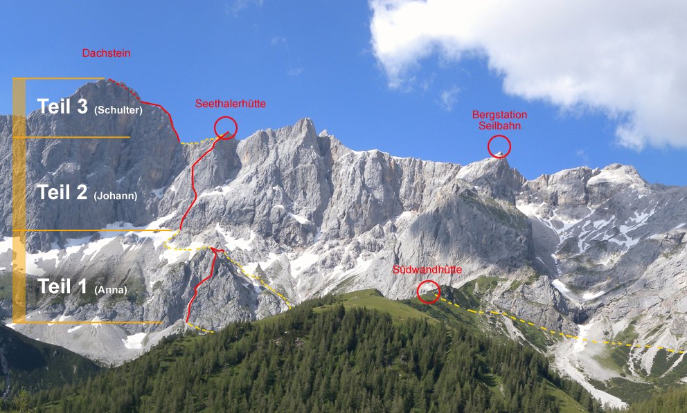 Leider sind die Steige seit einigen Jahren sehr überlaufen und es bilden sich lange Wartezeiten. Dazu kommt noch, dass die sehr steilen Schneefelder zwischen Anna und Johann auch ein ernstes Problem werden können, da man sie öfter ohne Steigeisen und ensprechende Kenntnisse nicht sichder überwinden kannn.