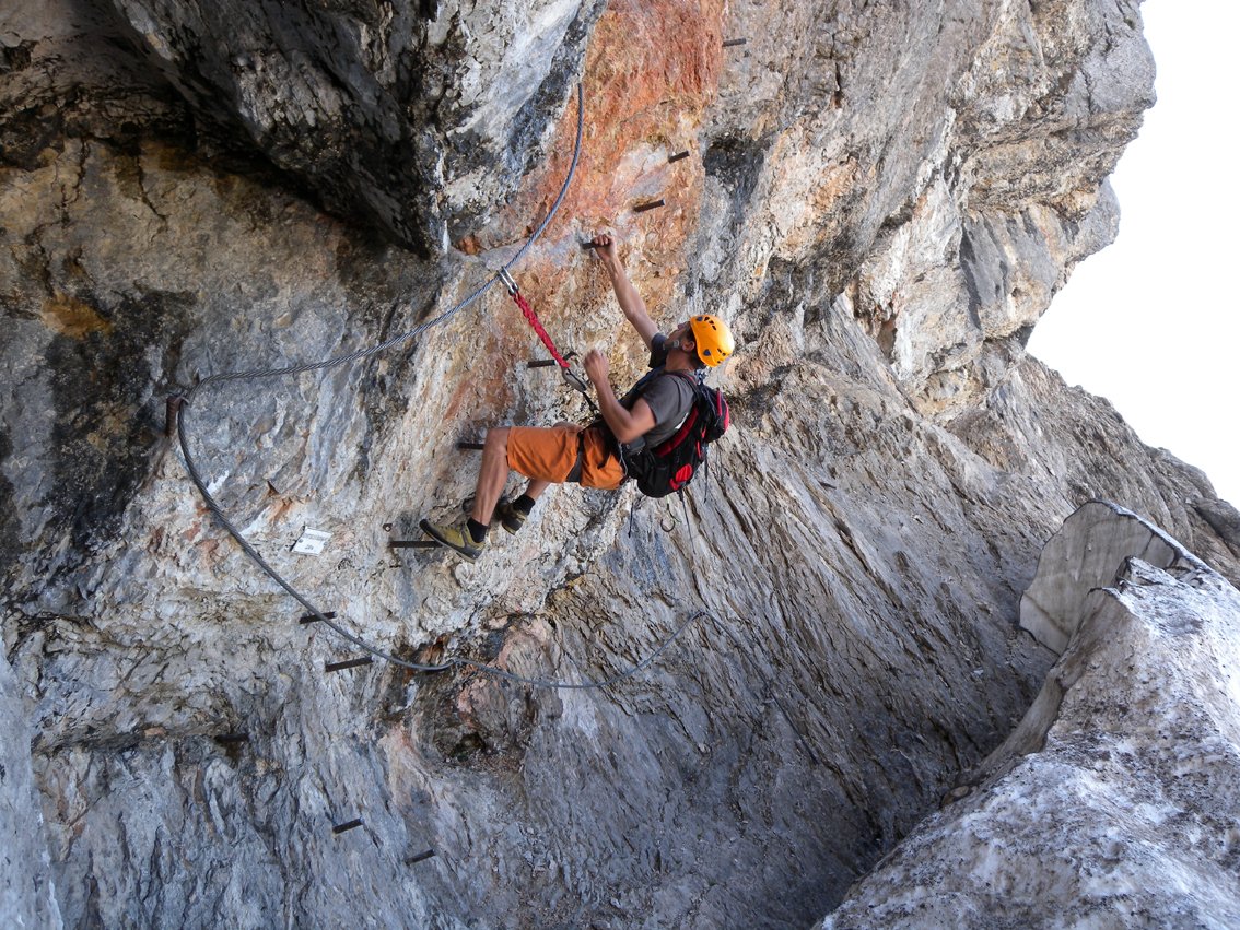 1. Notabstieg nach Anna Klettersteig: In der Scharte rechts den roten Punkten (versichert A/B) hinunter zur Südwandhütte folgen, ca. 40 min.