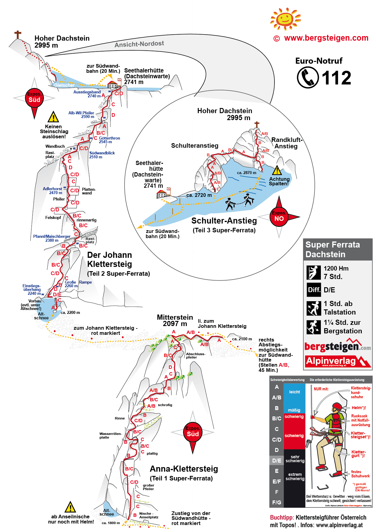 Ein langer ergibt sich durch die seit Sommer 2010 mögliche Kombination von drei Klettersteigtouren an der Dachstein Südseite. Fast genau 1200 Hm sind es vom Beginn der Stahlseil-Sicherung bis zum Ende des Seils auf dem Dachsteingipfel. Aber nicht nur die Höhenmeter können sich sehen lassen - auch die zu bewältigenden Schwierigkeiten sind mit dem Grad D/E ganz oben in der Skala angesiedelt. Dazu kommen noch ein paar weitere Erschwernisse, wie oft hart gefrorene Schneefelder und ein Abstieg über den Gletscher, die gute alpinistische Erfahrung erfordern - also nur etwas für Könner! Entschädigt für den hohen Einsatz an Kraft und Ausdauer wird man mit atemberaubenden, ausgesetzten und steilen Vertikalpassagen auf dem Klettersteig. Steht man schlussendlich auf dem fast 3000 Meter hohen Gipfel hat man tolle Ausblicke bis weit zu den Eisriesen der Hohentauern.