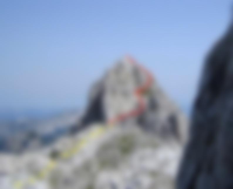 Vom Beginn der Versicherungen zuerst eine glatte Plattenquerung in eine Rinne. Diese gerade empor (Schlüsselstelle, A/B) zur nächsten leichten Rechtsquerung und zu einer schrägen Rampe. Danach auf dem Grat zum Hauptgipfel oder kurz davor rechts ab zum Nebengipfel mit Buch.