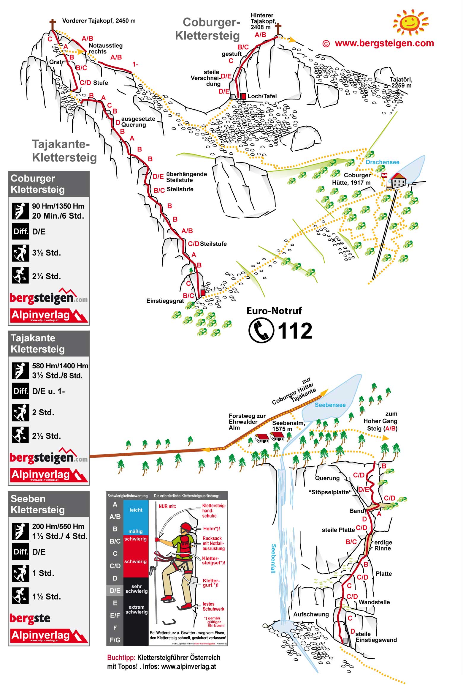 Der Steig ist sehr gut versichert. Für den Abstieg ist Trittsicherheit unerlässlich (felsdurchsetztes Schuttgelände). Begeht man die Ferrata in Kombination mit dem Seeben-Klettersteig, ist dies ein gewaltiges Unternehmen, das den Gesamtanspruch 3 verdient. Wer selbst dann noch nicht genug hat und über genügend Kraftreserven verfügt, der kann noch den Coburger-Klettersteig (D/E) anhängen - von der Scharte zwischen Vorderen und Hinteren Tajakopf und weiter zum Einstieg (siehe Toposkizze). Auch vom Gipfel des Hinteren Tajakopfes kann man den herrlichen Ausblick zum Zugspitzmassiv genießen.