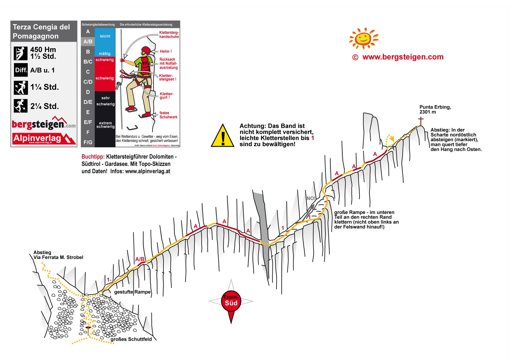 Links neben dem Spital auf der Wiese hinauf bis man auf den Wanderweg trifft. Auf diesem dann nach rechts aufsteigen bis dieser flach nach links verläuft. Bei einem Flachstück (Felsblock und Bank) zweigt links der Weg zum "Terza Cengia" ab. Man gelangt nach einer Latschenzone in ein Schuttfeld, wo von rechts ein Weg hinzu kommt (Wegweiser). Man steigt das Schuttfeld gerade bis zu den Felsen hinauf, quert dann rechts zum rampenartigen Band (Einstieg).