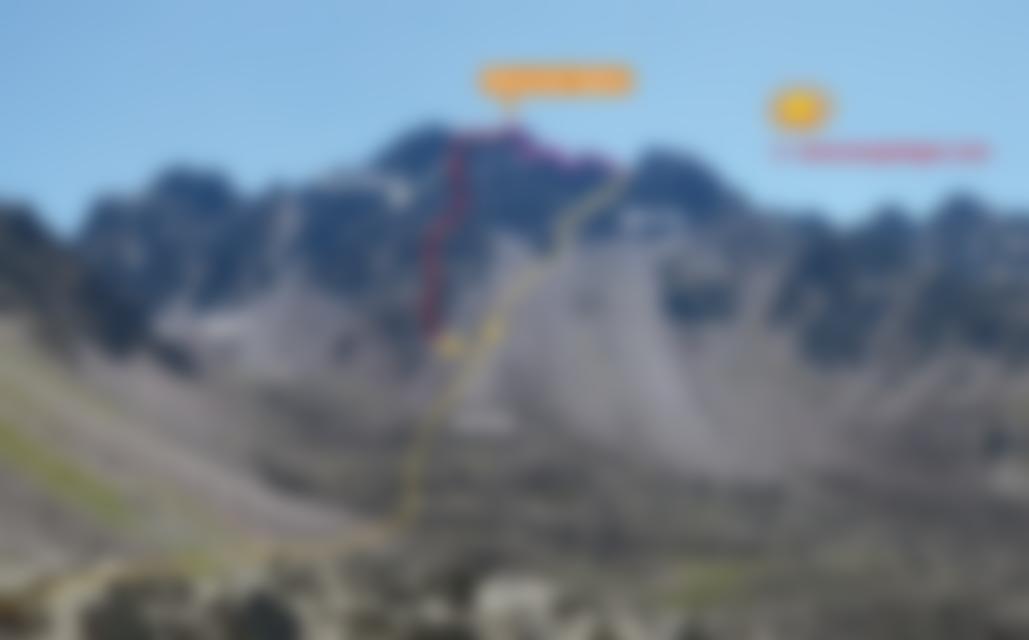 Siehe Topo. Der Anstieg folgt im Wesentlichen dem Grat. Die schwierigen Stellen findet man beim Einstieg und im oberen Teil. Im Mittelteil ist ein Abstecher auf einen freistehenden Turm (Var. D/E) möglich.