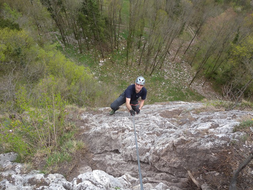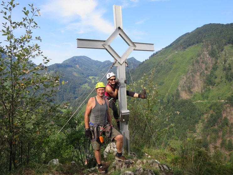 Vom Gipfel kurz östlich auf dem Grat absteigen, dann rechts auf dem Abstiegssteig hinunter zum Forstweg und zurück zum Parkplatz. Der Abstiegssteig ist kurz B und oft A - Klettersteigausrüstung also nicht auf dem Gipfel ausziehen.