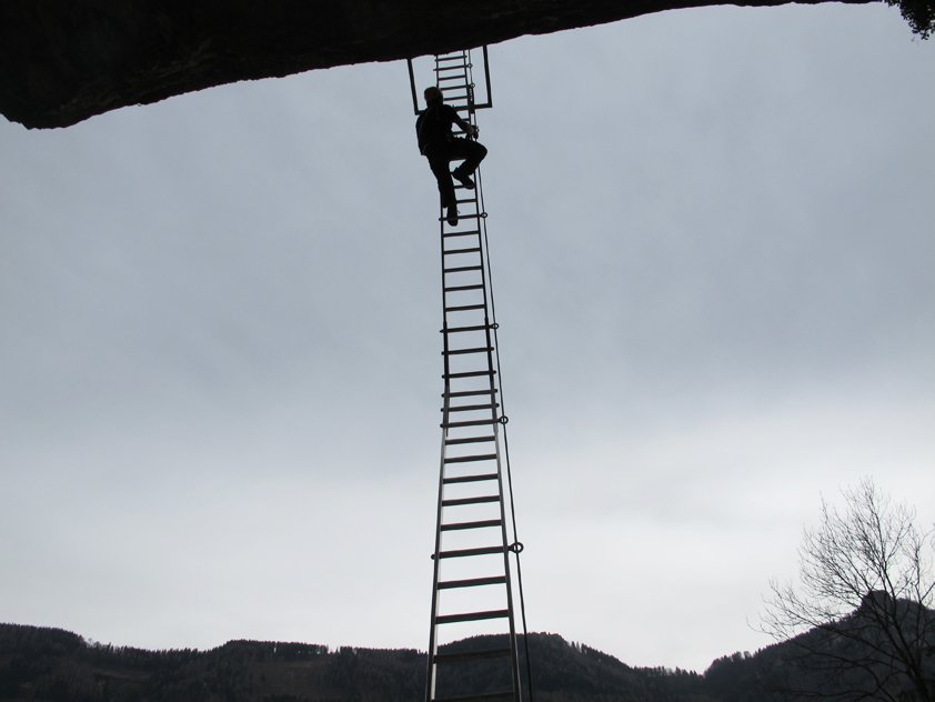 Die Felswand wurde im wahrsten Sinne des Wortes systematisch mit Klettersteigen überzogen. Die Infotafel zeigt gleich was ab geht, vom Übungsklettersteig „The little Rock“ (Stelle C) bis zur megaschweren „Mammut-Route“ (solide und recht anhaltend E) reicht die Auswahl. Der Trattenbacher Klettersteig ist die leichteste Möglichkeit in der oberen Wand der Beisteinmauer über die lange Seilbrücke und die spektakuläre Aluleiter zum Gipfel zu steigen.