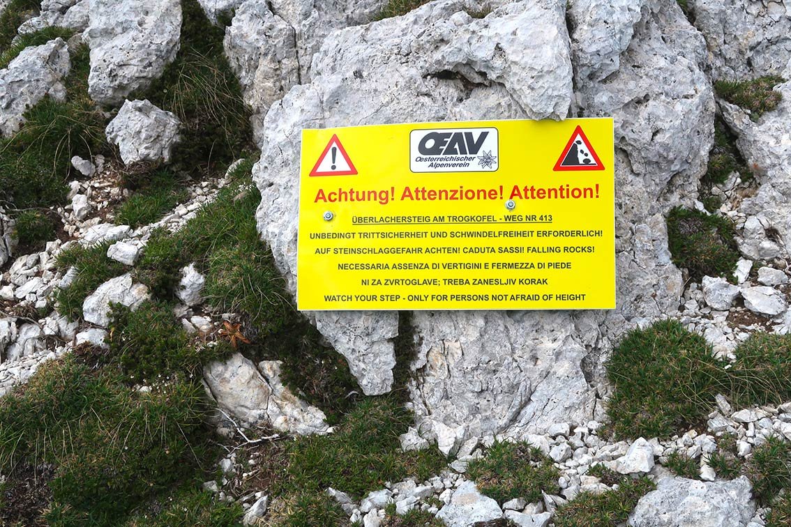 Der Uiberlacher Weg ist ein überraschend einfacher, aber doch interessanter Steig durch die Trogkofel-Ostwand. Wegen der vielen ungesicherten Schrofenpassagen eher ein schwarzer Bergweg als ein Klettersteig. Der Weg 413 - mit dieser Nummer ist der Uiberlacher Weg markiert, ist nicht für Ungeübte ohne Trittsicherheit geeignet.
