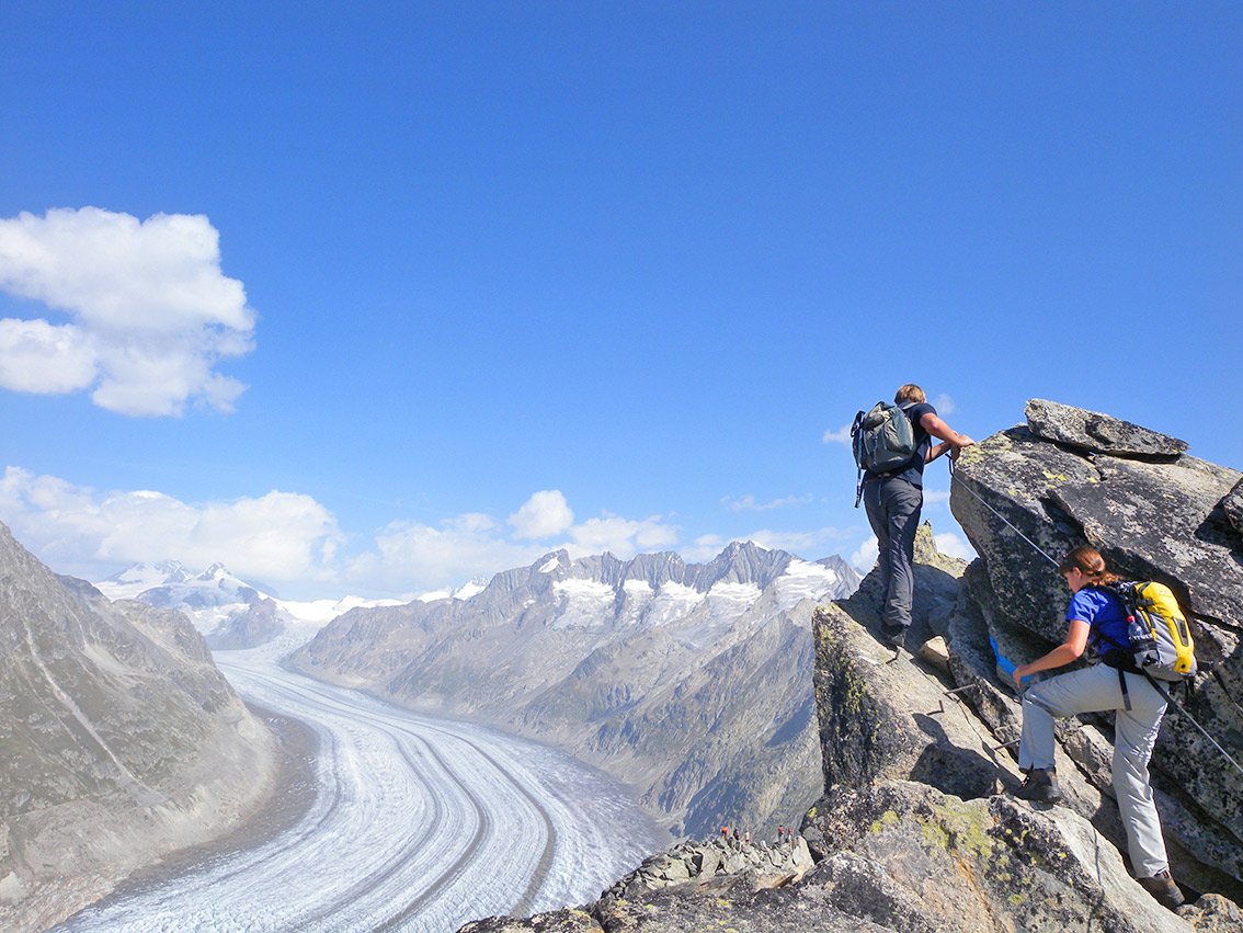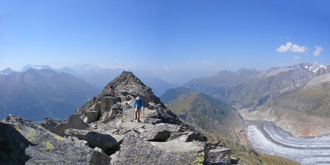 Schöne Kammwanderung mit kurzen versicherten Abschnitten. Man hat fast immer einen perfekten Blick auf den Großen Aletschgletscher. Wer noch etwas Zeit hat, sollte den 2927 m hohen Gipfel des Eggishorns unbedingt „mitnehmen“. Die 100 Hm zusätzlich werden mit einer noch besseren Aussicht auf den Großen Aletschgletscher belohnt.