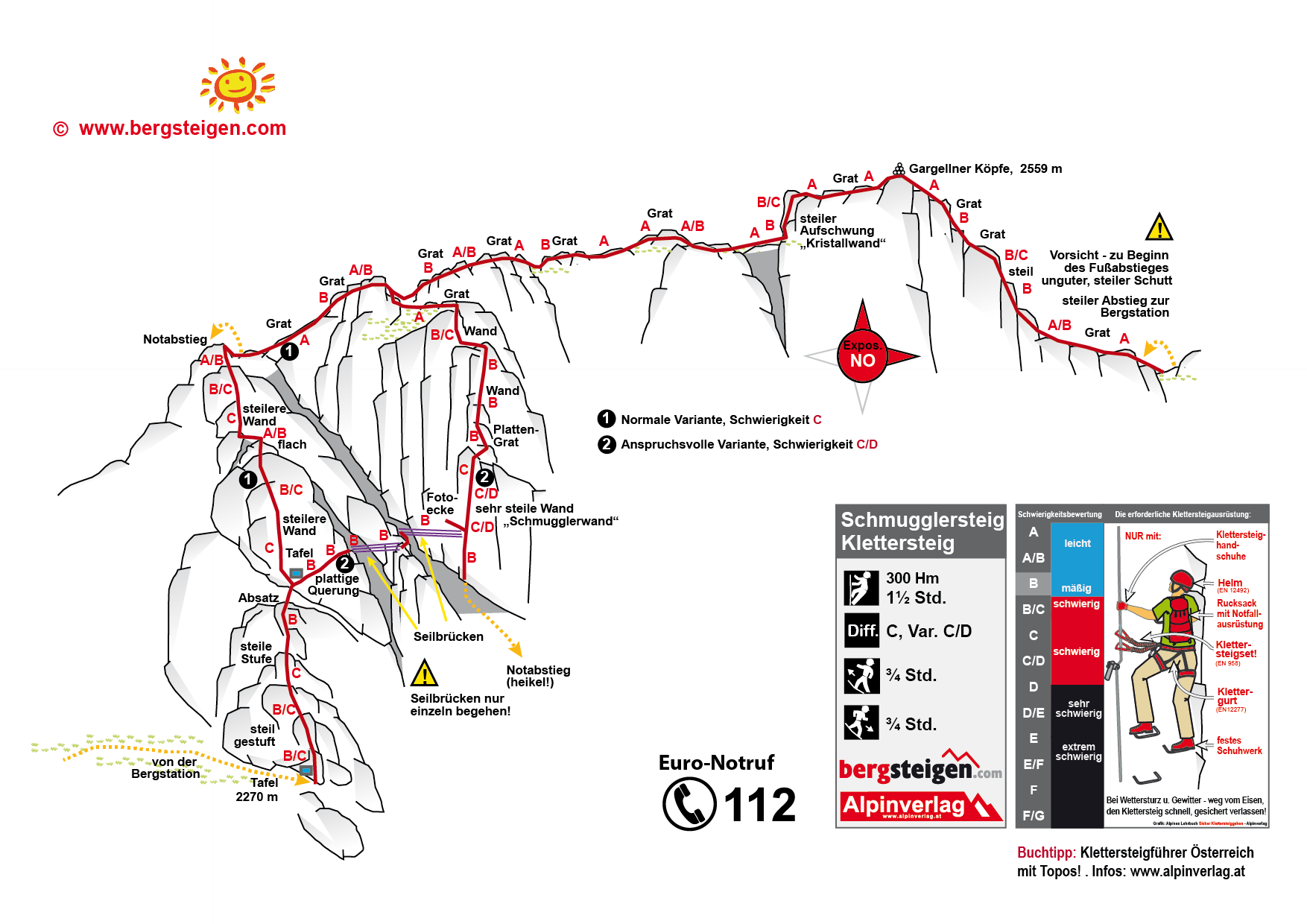 Schwere Variante: Vom Absatz mit der Tafel über eine Platte (B) nach rechts zur ersten Seilbrücke (19 m; B). Danach kurz einen Grat (B) hinauf zur zweiten Seilbrücke (23 m, B). Nach dieser sehr steil in der leicht überhängenden Schmugglerwand hinauf (C/D, ganz oben dann C) in flacheres Gelände. Über einen Plattengrat (B) und einen Aufschwung (B) erreicht man eine kurze Steilstufe (B/C), die einen zu einem leichten Grat (A) führt und an dessen Ende man auf die leichte Variante trifft.