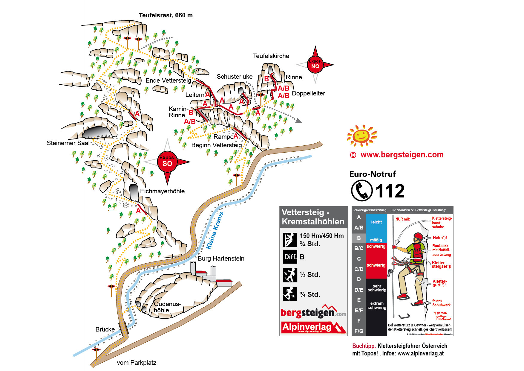 Auf dem Fahrweg in Richtung Burg Hartenstein, davor aber links hinunter zur Kleinen Krems. Am Fluss über die Brücke und dem Bachlauf bis zur Abzweigung "Vettersteig" folgen (die Gudenushöhle ist am Fluss unterhalb der Burg; auf der anderen Bachseite, gelbe Tafel an der Höhle). Bei der Abzweigung "Vettersteig" auf dem Pfad hinauf bis zur Einstiegsrampe.