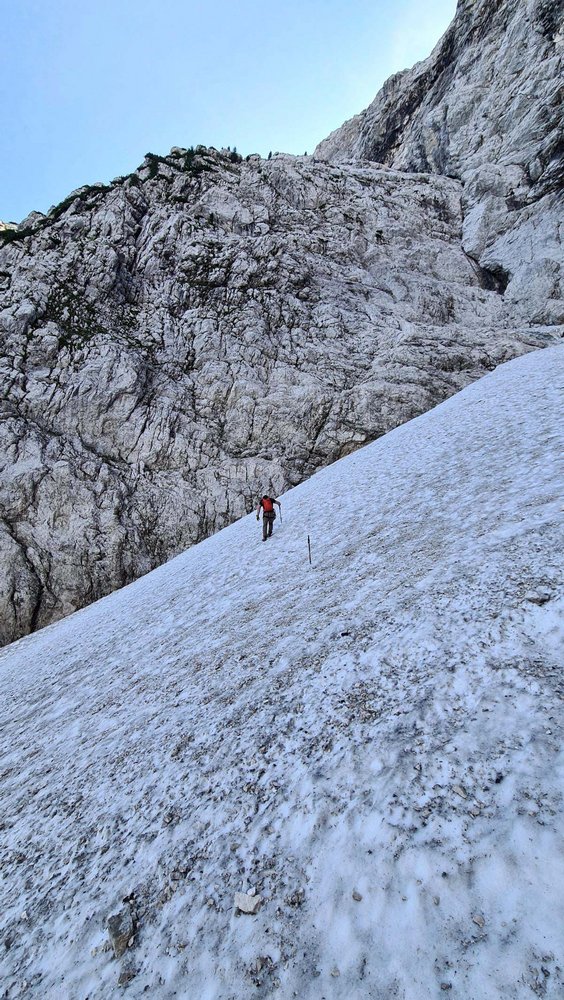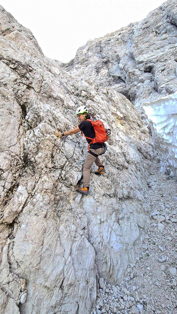 Um zum Einstieg zu gelangen, muss man ein Schneefeld queren. Grödel, Leichtsteigeisen oder ein Pickel sind von Vorteil! Der Einstieg ist mit C zu bewerten und ist gleichzeitig die schwerste Stelle des Klettersteigs.
