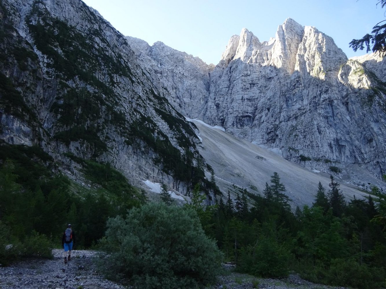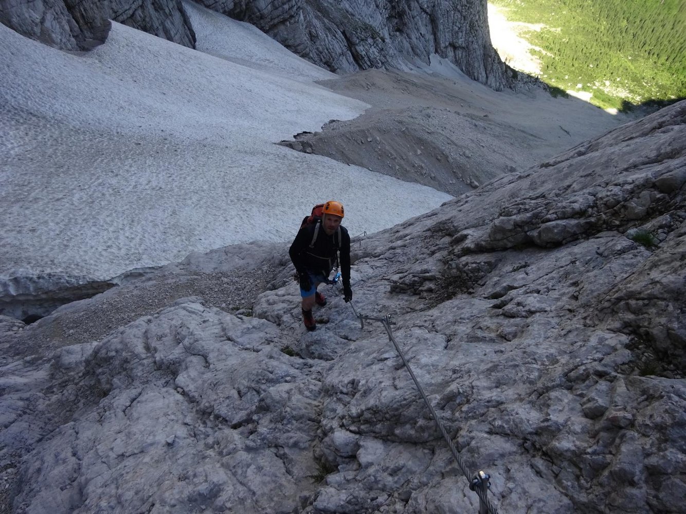 Super Alternative: Mit dem E-Bike kann man sehr schnell über die Forststraße (Nr. 512) Richtung Rifugio Zacchi (1380m) zusteigen. Kurz vor der Hütte nimmt man den Weg 513. Auf diesem wieder ca. 400 Meter weiter (gute Beschilderung), bis man zur Weggabelung kommt, wo man linker Hand den Weiterweg ins Schuttkar unter die Veunza nimmt. Das Schuttkar hoch (rote Markierungen) bis zur Mittelmorände des Schneefelds. Hier nach links queren zum Einstieg. (Dann Gesamtzeit Auto bis Einstieg Klettersteig ca. 1h 30min).